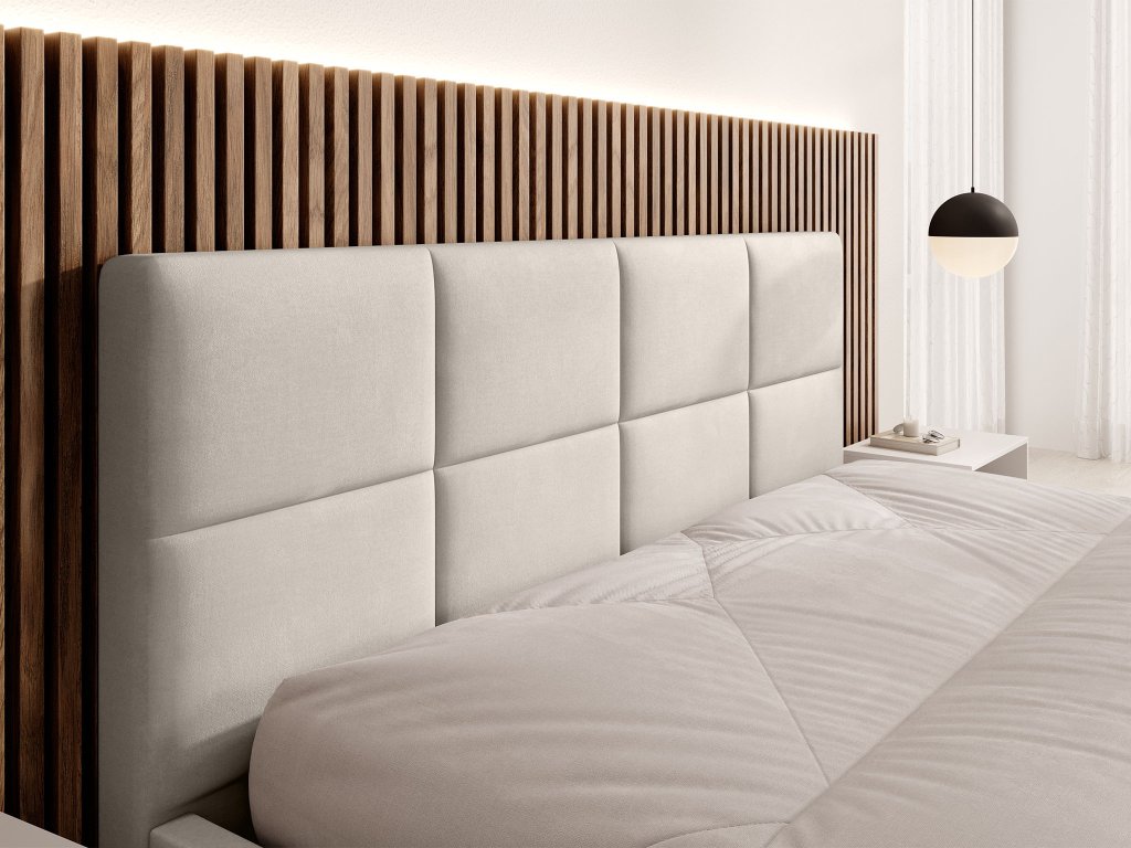 Čalúnenie tvorí hebká látka Velluto so zamatovou štruktúrou a jemným odleskom. Je príjemná na dotyk, odolná voči oderu a jednoduchá na údržbu. Dodáva posteli luxusný aj útulný charakter zároveň, zvýrazňuje jej čisté línie a vnáša do spálne hrejivú eleganciu. Spodná časť postele je prekrytá textíliou typu Fibertex, ktorá zlepšuje prístupnosť pri čistení, podporuje lepšiu cirkuláciu vzduchu a dá sa jednoducho odopnúť a povysávať.