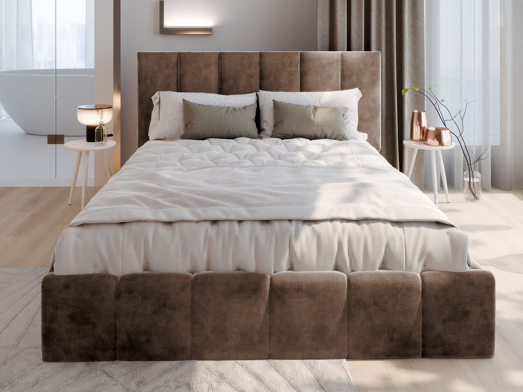 Ak hľadáte posteľ, ktorá premení vašu spálňu na miesto oddychu a harmónie, manželská posteľ Taranto 160x200 cm v svetlohnedom prevedení je tou správnou voľbou. Jemný prírodný odtieň hnedého velúru pôsobí hrejivo, elegantne a ľahko sa kombinuje s ďalšími farbami interiéru – či už preferujete moderný minimalizmus alebo klasický štýl. Dominantou postele je vysoké čelo s jemným prešívaním, ktoré jej dodáva sofistikovaný vzhľad a zároveň poskytuje praktickú oporu pri čítaní alebo sledovaní televízie. Konštrukcia postele je pevná a stabilná, takže vám zaručí komfortný a ničím nerušený spánok.