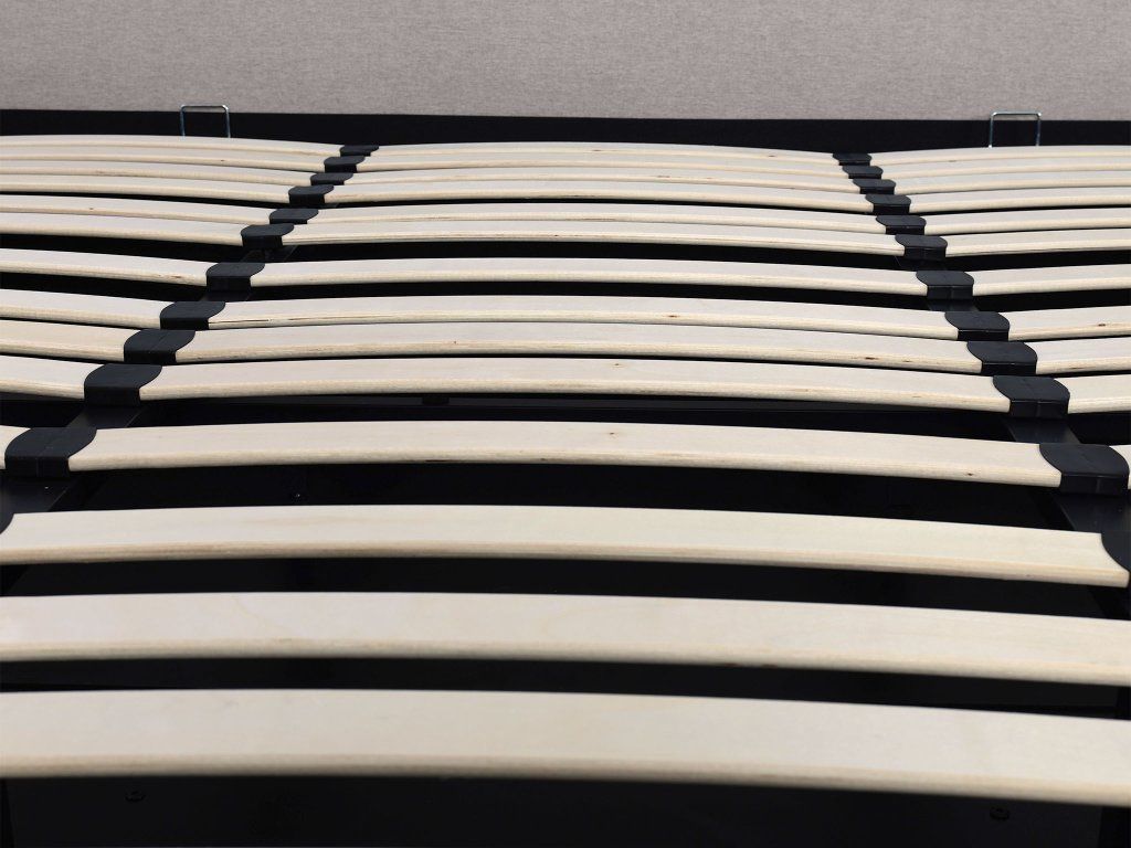 Posteľ stojí na pevných čiernych nožičkách, ktoré zabezpečujú výbornú stabilitu a zároveň dodávajú celku moderný kontrastný vzhľad. Kvalitný rošt s pružnými lamelami podporuje správne uloženie matraca a prispieva k zdravému a pohodlnému spánku. Základ postele tvorí odolná preglejková konštrukcia. Tento vrstvený drevený materiál je známy svojou vysokou pevnosťou a tvarovou stálosťou.