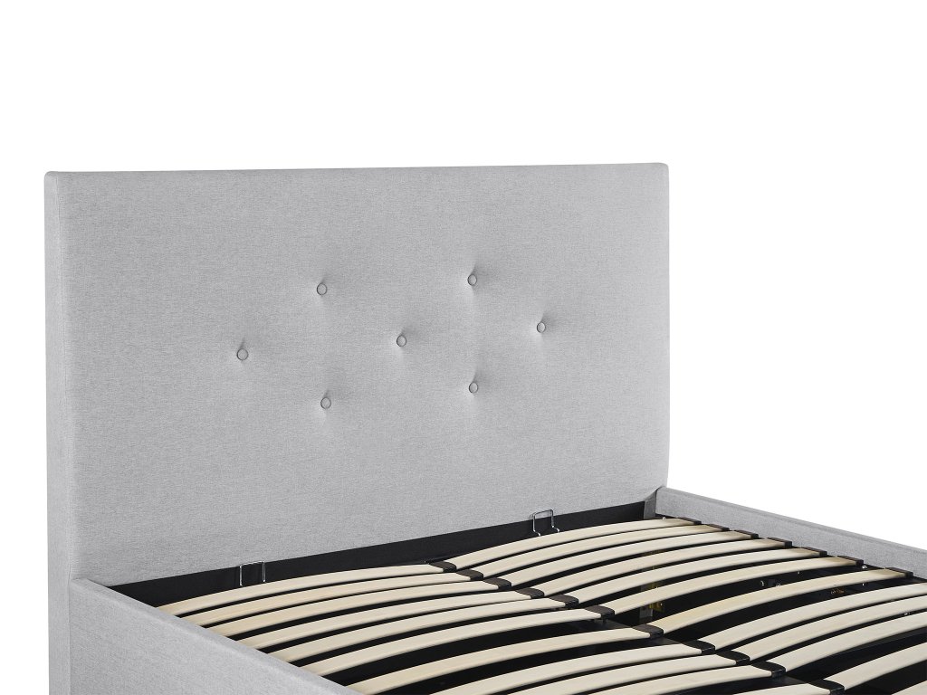 Posteľ Zolly je postavená na pevných čiernych nožičkách, ktoré zabezpečujú výbornú stabilitu a zároveň vytvárajú moderný kontrast so sivým čalúnením. Kovový rošt s pružnými lamelami podporuje matrac a prispieva k zdravému a pohodlnému spánku. Konštrukcia je navrhnutá tak, aby vydržala každodenné používanie a dlhodobú záťaž.