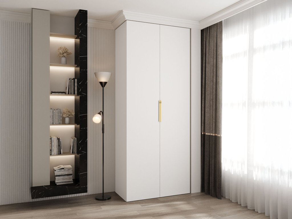 Skriňa Como 4 je skvelou voľbou, pokiaľ hľádate moderný a elegantný nábytok do svojej predsiene, obývačky, poprípadne do spálne. Táto biela skriňa so zlatými kovovými úchytkami spája kvalitu a funkčnosť. Vyrobená je z kvalitných materiálov, ako je laminovaná doska s matnym dizajnom a PVC dýha. Doska je odolná voči poškrabaniu. PVC materiál zaručuje dlhú životnosť. Vnútro skrine ponúka priestrannú kovovú tyč na vešanie oblečenia a praktické poličky, ktoré poskytujú dostatok miesta na prehľadné uloženie vecí. Táto šatníková skriňa je vďaka univerzálnej farbe a nadčasovému dizajnu ideálnym riešenim do vášho domova. Skriňa 100 cm Como je špecialne navrhnutá pre tých, ktorí preferujú kombináciu estetického a funkčného nábytku. A ak zvažujete rozdiely medzi leským a matným nábytkom, odporúčame prečítať si náš článok, ktorý vám pomôže vybrať ideálny povrh nábytku pre vašu domácnosť.