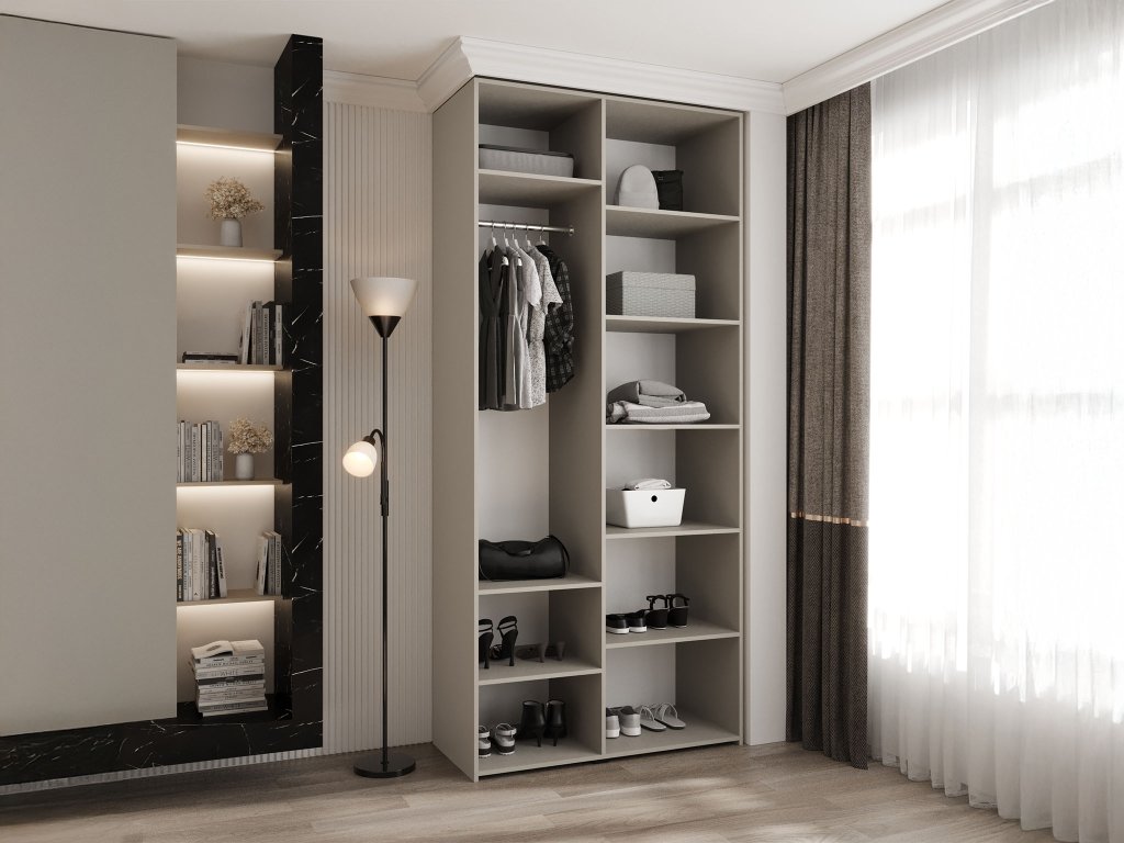 Priestranná skriňa Como 4 s tyčou na zavesenie a zabudovanými poličkami