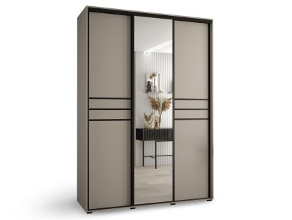 Šatníková skriňa do spálne Dakota 11 v kašmírovej farbe je skvelým riešením pre každého, kto hľadá modernú a funkčnú skriňu s dostatkom úložného priestoru. Je vybavená posuvnými dverami, na ktorých sa nachádza elegantné zrkadlo a čierna dekoračná lišta, čo jej dodáva sofistikovaný vzhľad. Vyrobená je z kvalitnej laminátovej dosky (16 mm) s PVC hranami (0,5 mm), čo zabezpečuje jej odolnosť a dlhú životnosť.