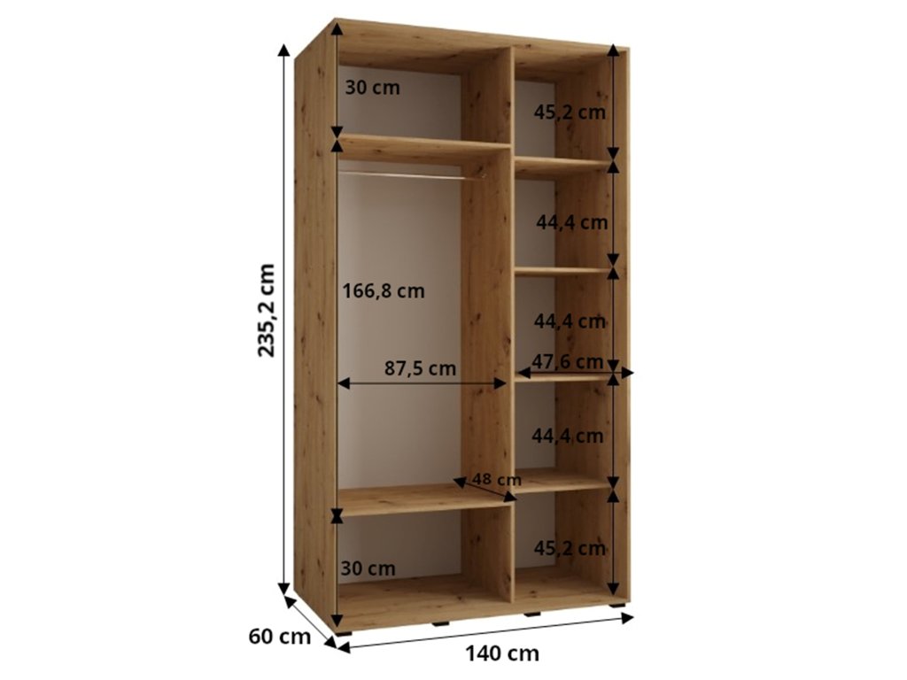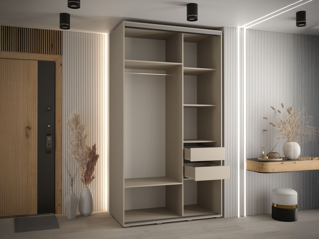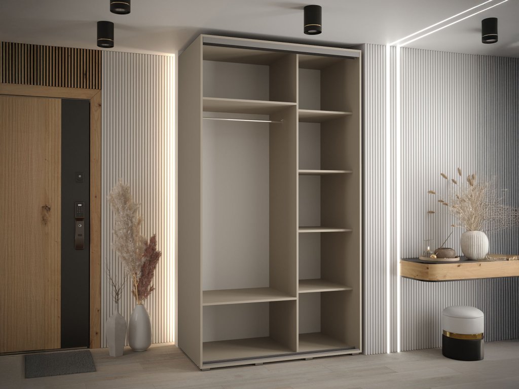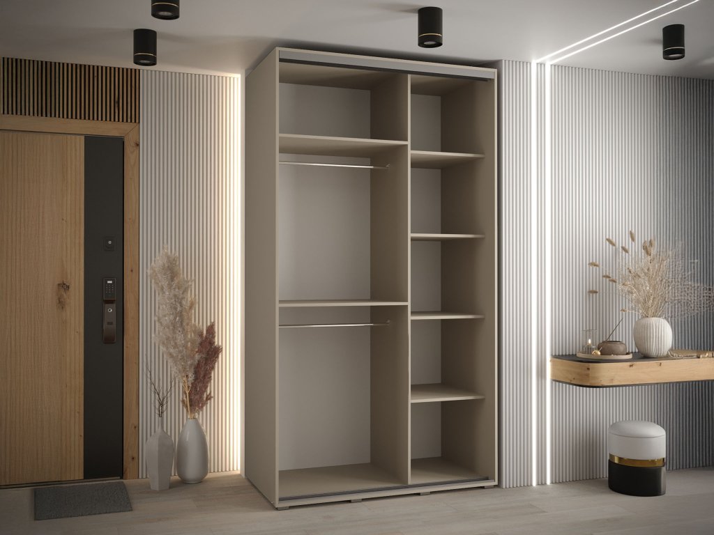 Vo vnútri skrine sú 2 kovové vešiakové tyče, ktoré si môžete prispôsobiť podľa vašich potrieb. Nad týmito tyčami sa nachádza praktická polica, ktorá je ideálna na sezónne oblečenie alebo rôzne doplnky. Skriňa má tiež 4 police, ktoré poskytujú ďalší úložný priestor na obuv, oblečenie alebo iné veci. Tento model je vhodný do spálne, obývačky alebo predsieňe.