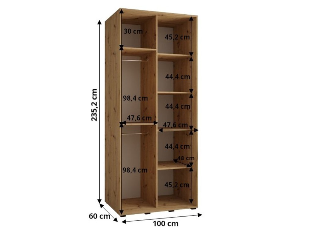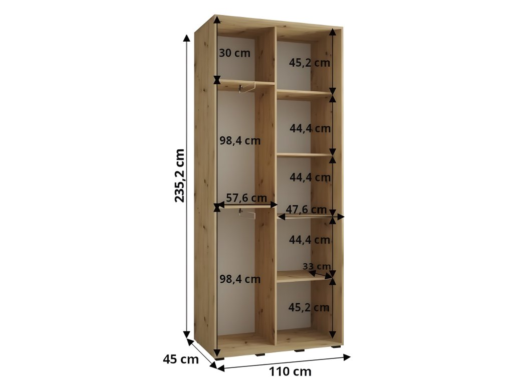 Dakota 2 má dvojo posuvných dverí so zrkadlami, vďaka čomu skvele zapadne do menších aj väčších miestností a opticky ich zväčší. Vo vnútri skrine nájdete 2 výsuvné tyče z kovu, ideálnu na praktické zavesenie oblečenia. Samozrejme, môžete využiť len jeden kus tejto tyče, všetko záleží na vašich preferenciách.