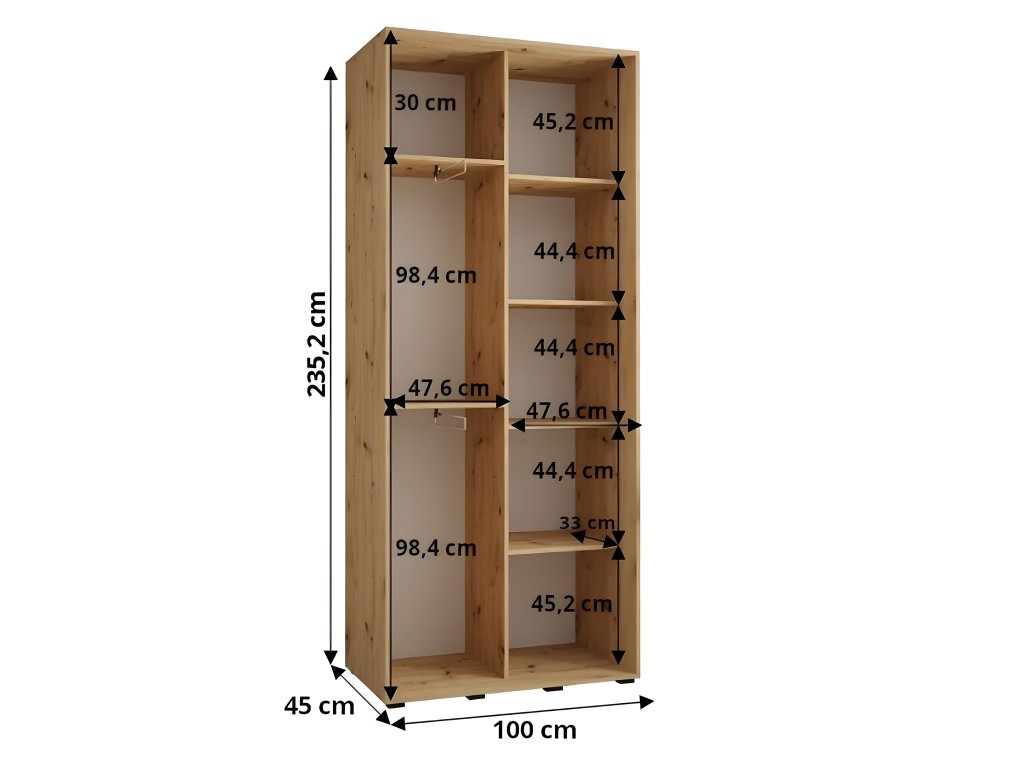 Skriňa je vyrobená z kvalitnej laminovanej dosky s ABS hranami a pevnej HDF dosky, čo jej poskytuje výnimočnú stabilitu a odolnosť. Plastové nožičky uľahčujú presúvanie a zabezpečujú dlhodobú spoľahlivosť. Dakota 2 je vybavená dvomi posuvnými dverami so zrkadlami, ktoré nielen opticky zväčšia priestor, ale aj umožnia skriňu umiestniť do menších i väčších miestností. Vnútorné vybavenie zahŕňa kovové výsuvné tyče na zavesenie oblečenia. Taktiež tam nájdete dve police, ktoré môžné variabilne umiestniť podľa svojich potrieb a preferencií.