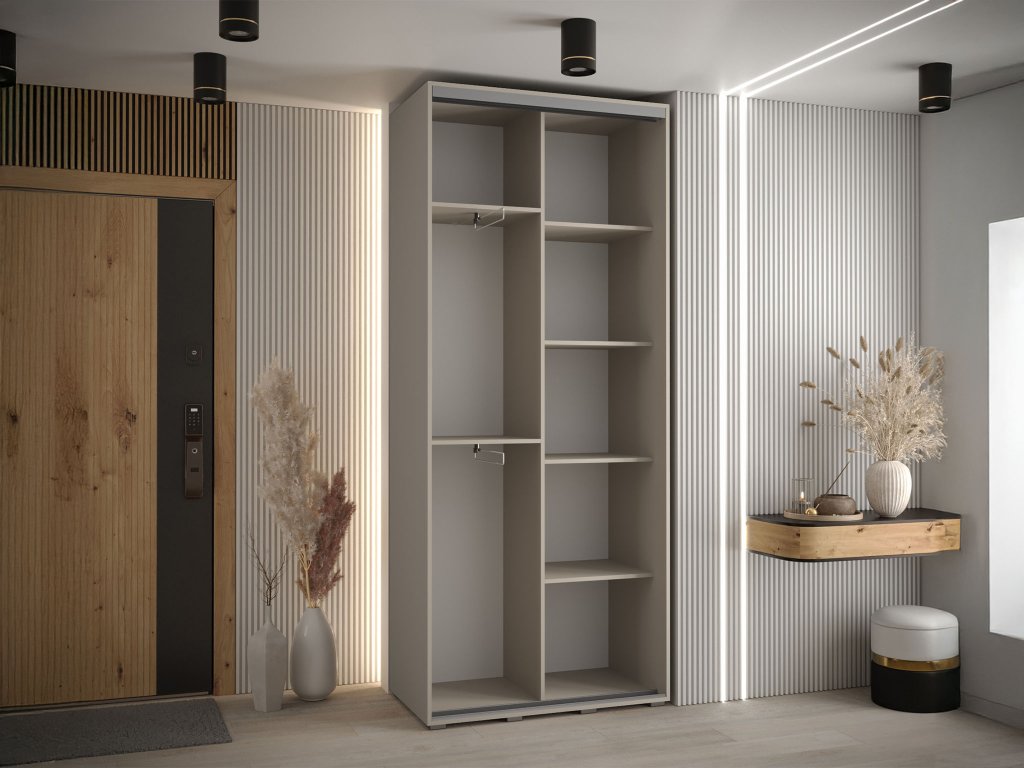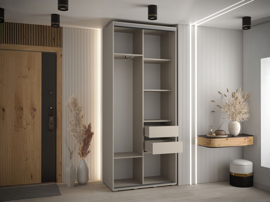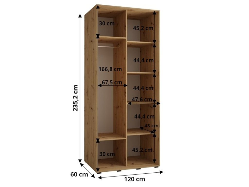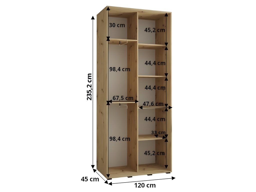 Skriňa 120 cm Dakota 2 disponuje praktickými posuvnými dverami so zrkadlami, ktoré nielen šetria priestor, ale aj vizuálne zväčšujú miestnosť. Vo vnútri nájdete aj dve výsuvné kovové tyče na zavesenie oblečenia, prispôsobené vašim potrebám.