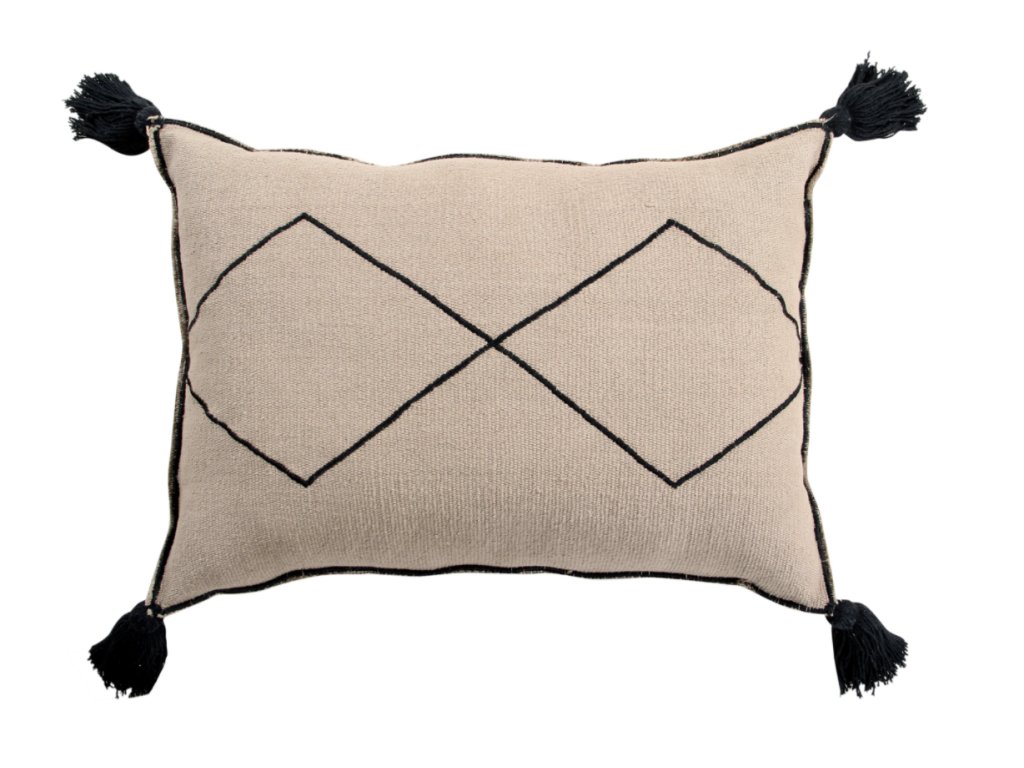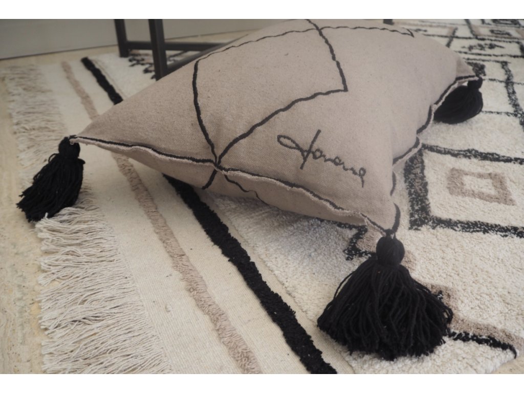 Vankúš BEREBER je vyrobený z kompaktnej tkaniny zo 100% bavlny a zo 100% polyesteru (výplň). Kosoštvorcové línie sú vyšívané, rohy sú zakončené čiernymi strapcami. Je ideálny do detských izieb, ako aj do obývacej izby na gauč, kreslo, hojdaciu sieť, podlahu alebo do spálne. Hlavnou výhodou je možnosť prať produkt v práčke.