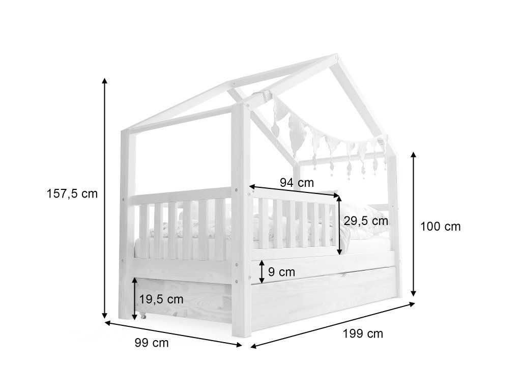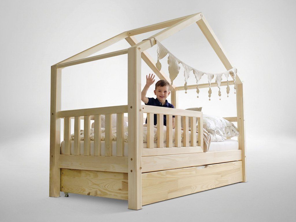 Povrch je hladko brúsený a všetky hrany sú zaoblené pre maximálnu bezpečnosť pri každodennom používaní. Súčasťou postele je praktická prístelka vo forme výsuvného šuflíka, ktorá umožňuje vytvorenie ďalšieho miesta na spanie – ideálne pre súrodenca alebo návštevu.