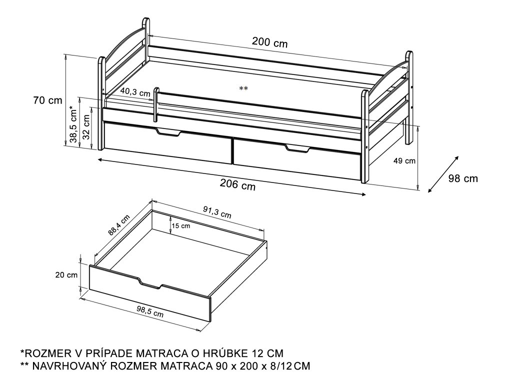 - Rozmery pre matrac: 90 x 12 x 200 cm