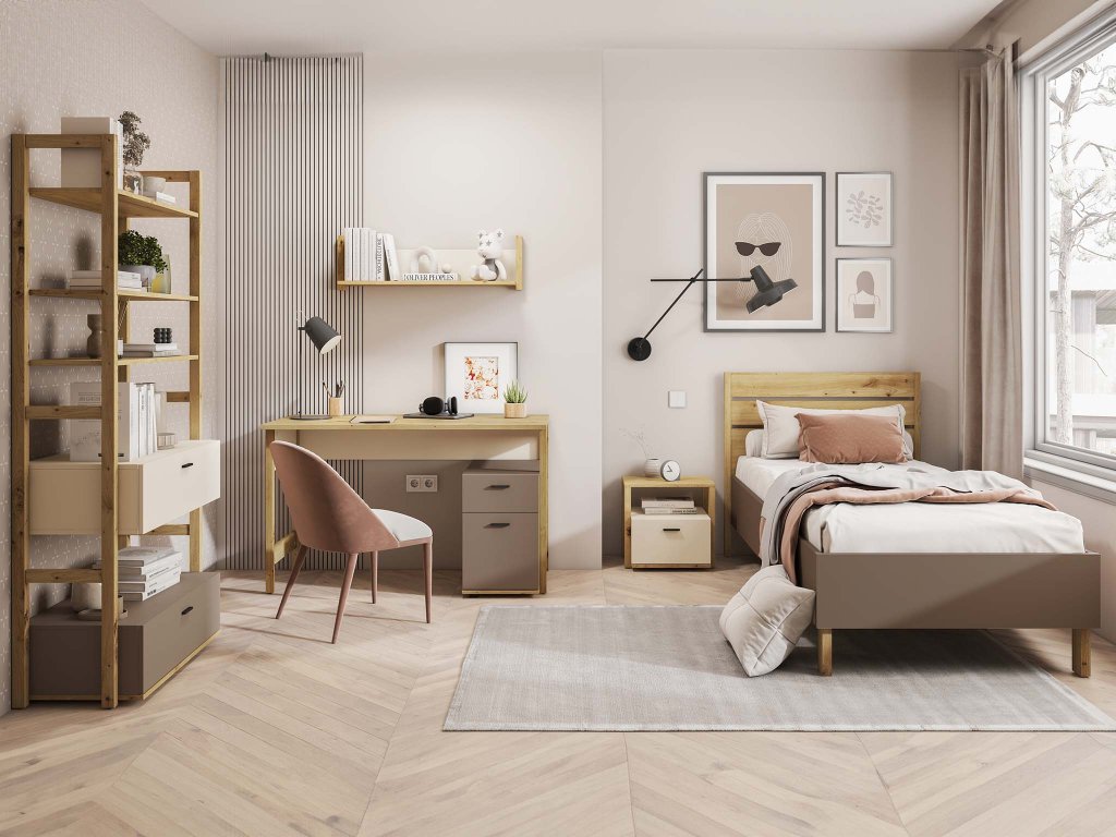 Hľadáte praktickú a detskú izbu? Kolekcia nábytku LENNY prináša moderné a praktické riešenia pre detské izby. Zahŕňa posteľ, šatníkovú skriňu, nočný stolík, police, písací stôl, komodu, ktoré ponúkajú dostatok úložného priestoru a funkčné usporiadanie. Nábytok je vyrobený z odolnej 16 mm laminovanej drevotriesky v krémovo-hnedej farbe, doplnenej o prvky surového dreva, ktoré dodávajú prirodzený a harmonický vzhľad. Perfektná voľba pre štýlovú a praktickú detskú izbu.