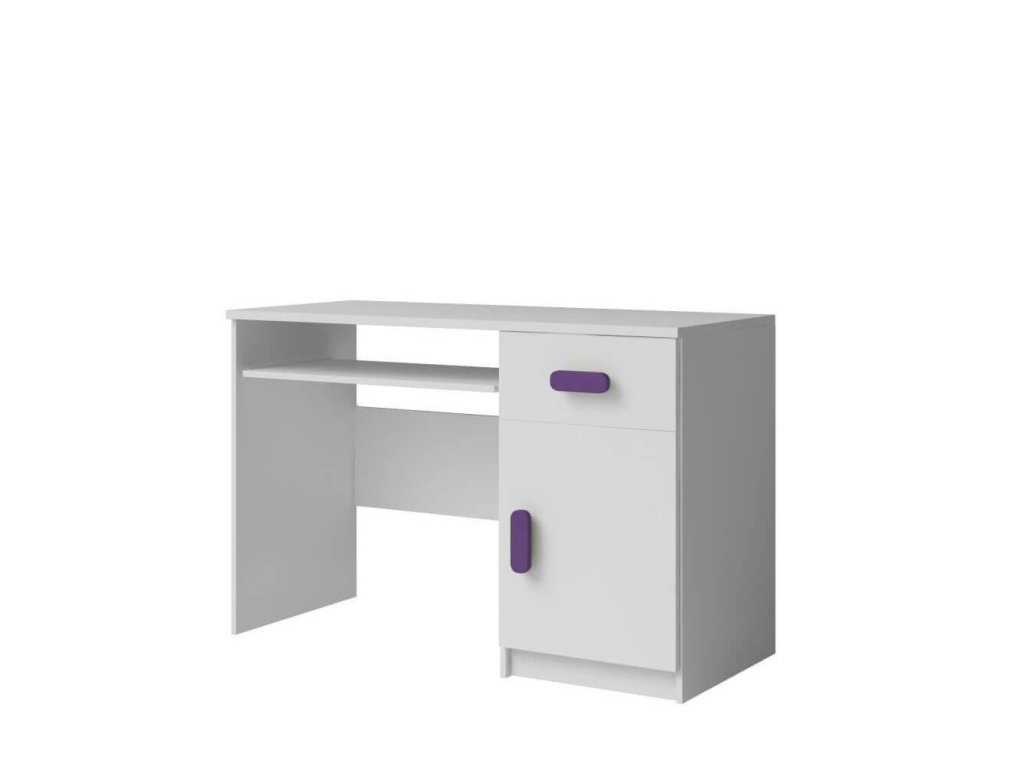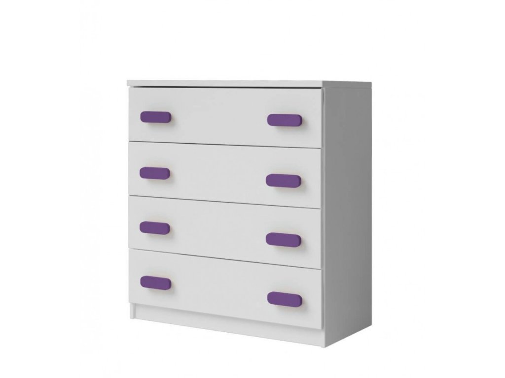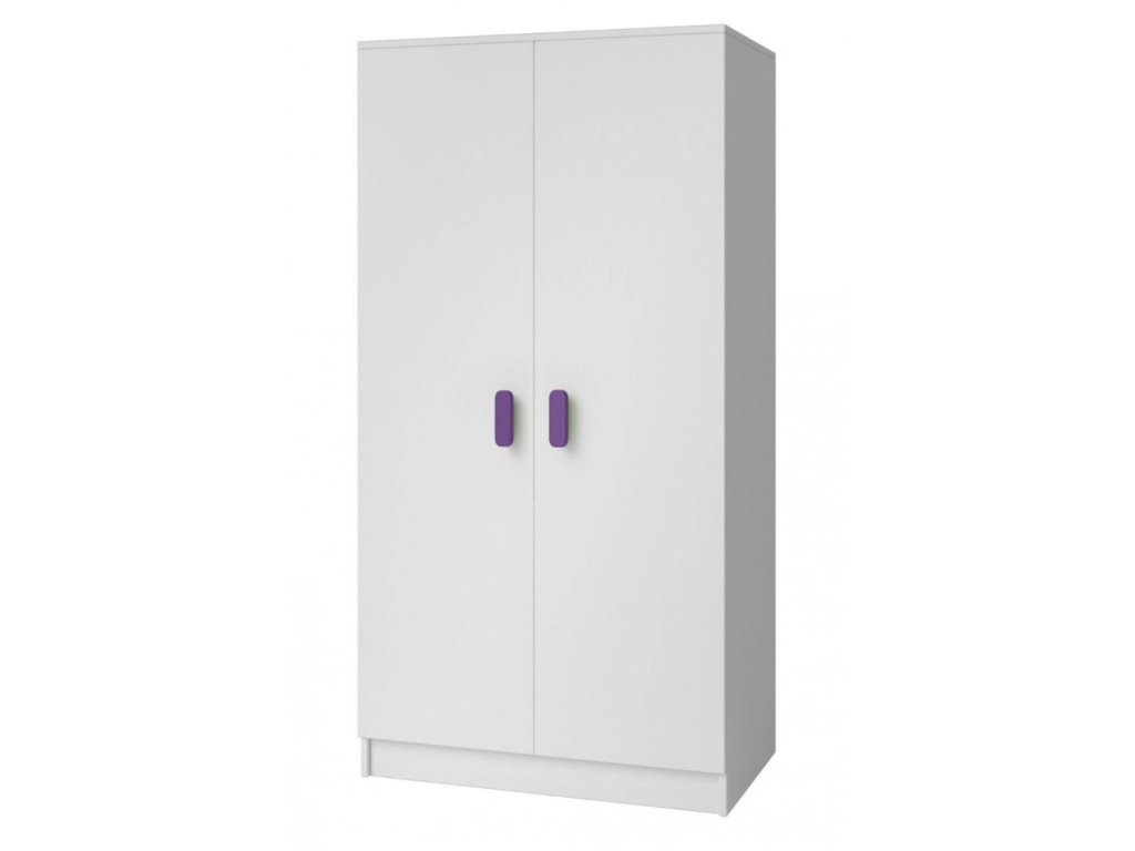 Detská izba s jednoduchým dizajnom a fialovými úchytmi. Táto zostava je vyrobená z laminovaných dosiek v hrúbke 16 mm. Polica nie je súčasťou zostavy, ale je možné si ju doobjednať. Rošt nie je súčasťou postele. Posteľ je dodávaná bez matraca.
