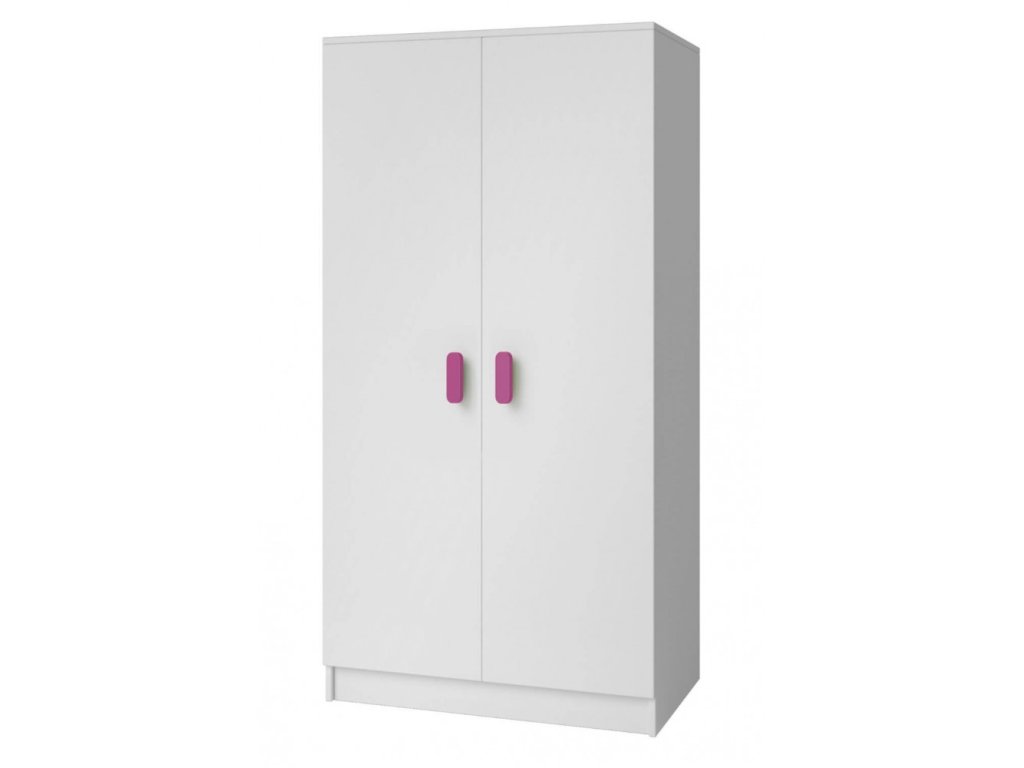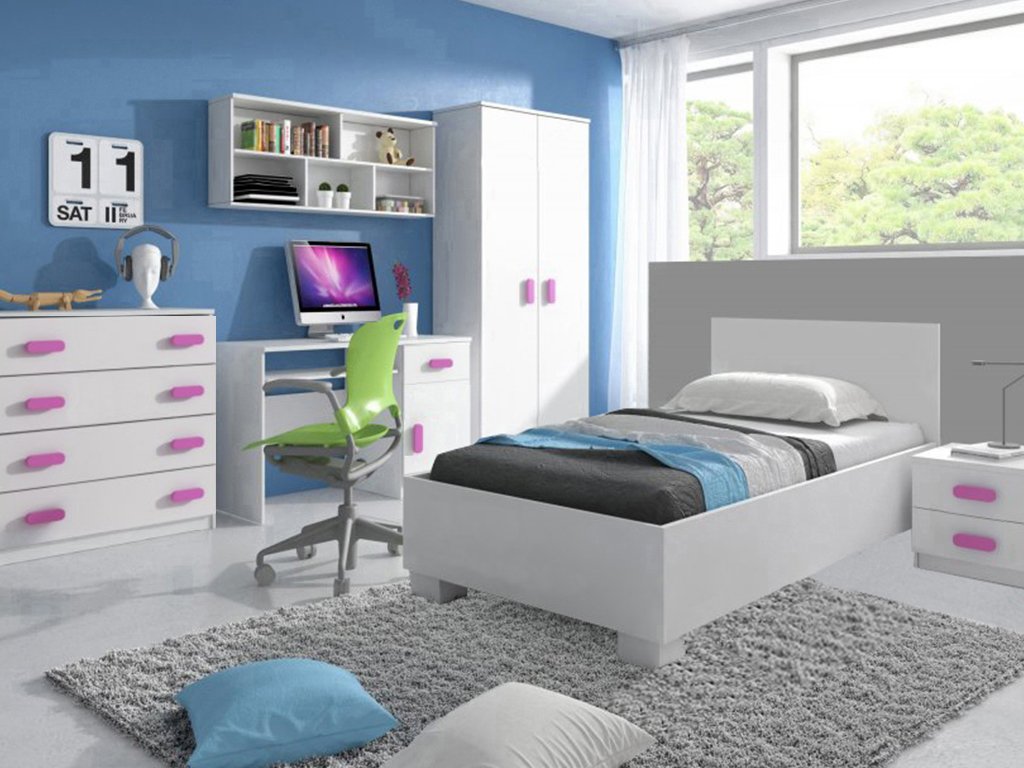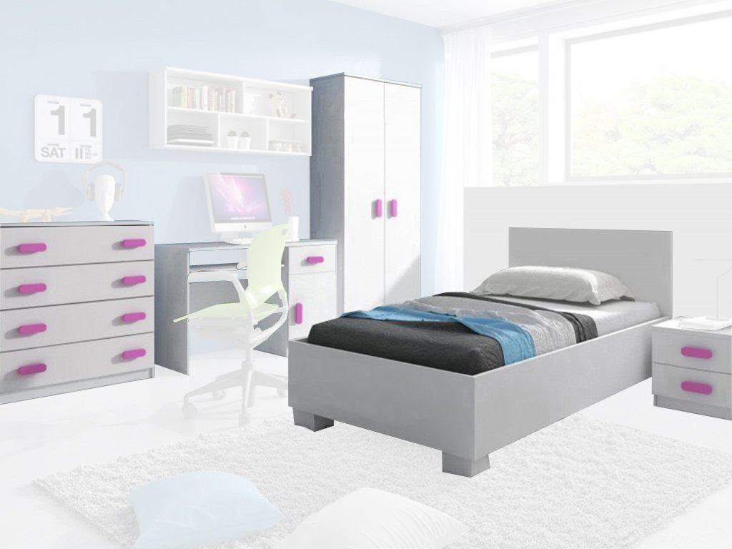 Detská izba s jednoduchým dizajnom a ružovými úchytmi. Táto zostava je vyrobená z laminovaných dosiek v hrúbke 16 mm. Polica nie je súčasťou zostavy, ale je možné si ju doobjednať. Posteľ je dodávaná bez matraca a rošta.