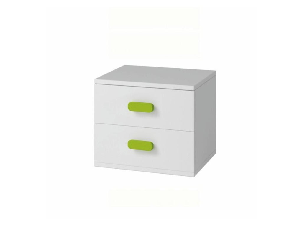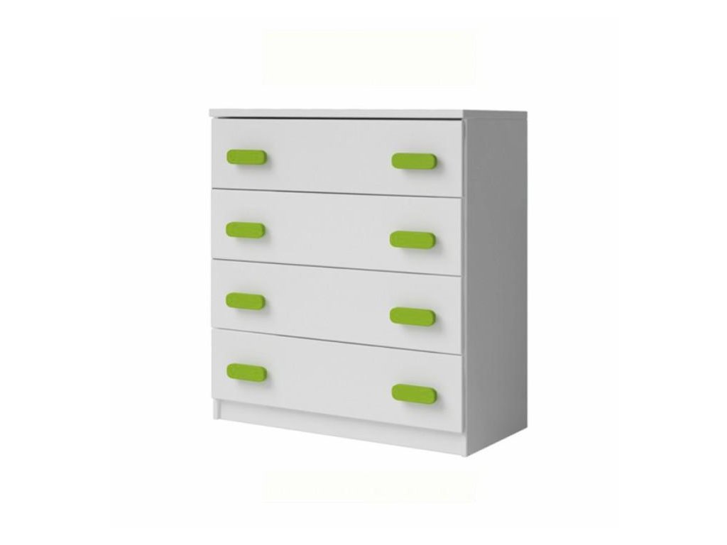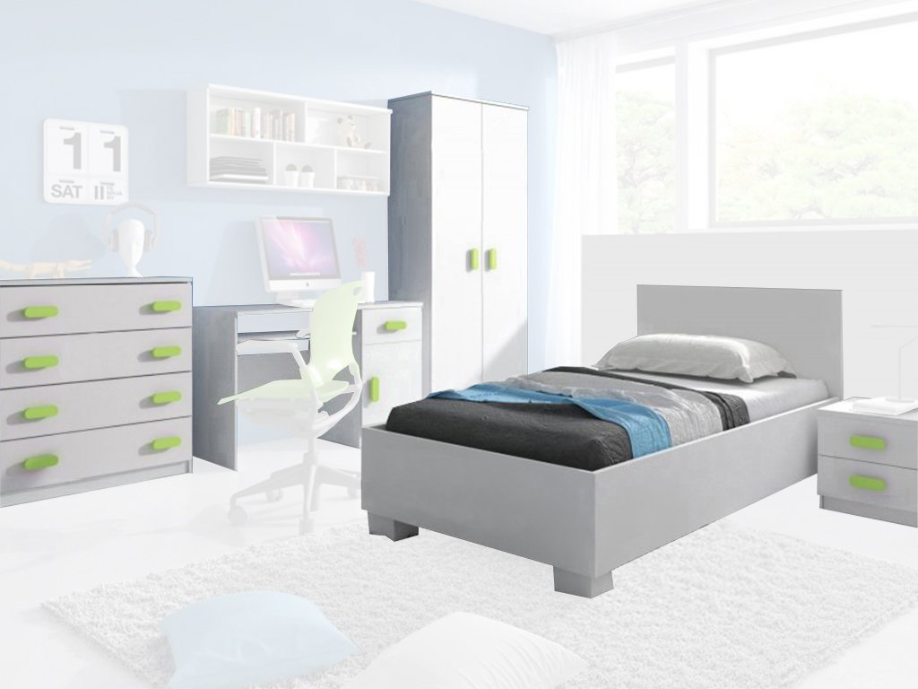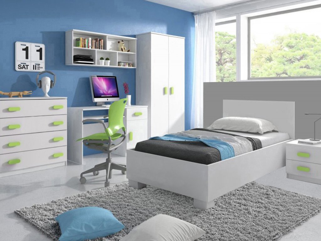 Krásna nábytková zostava Loop v krásnej bielej farbe so zelenými úchytkami. Táto zostava je vyrobená z laminovaných dosiek v hrúbke 16 mm. Posteľ nie je dodávaná s matracom. Súčasťou postele je rošt.