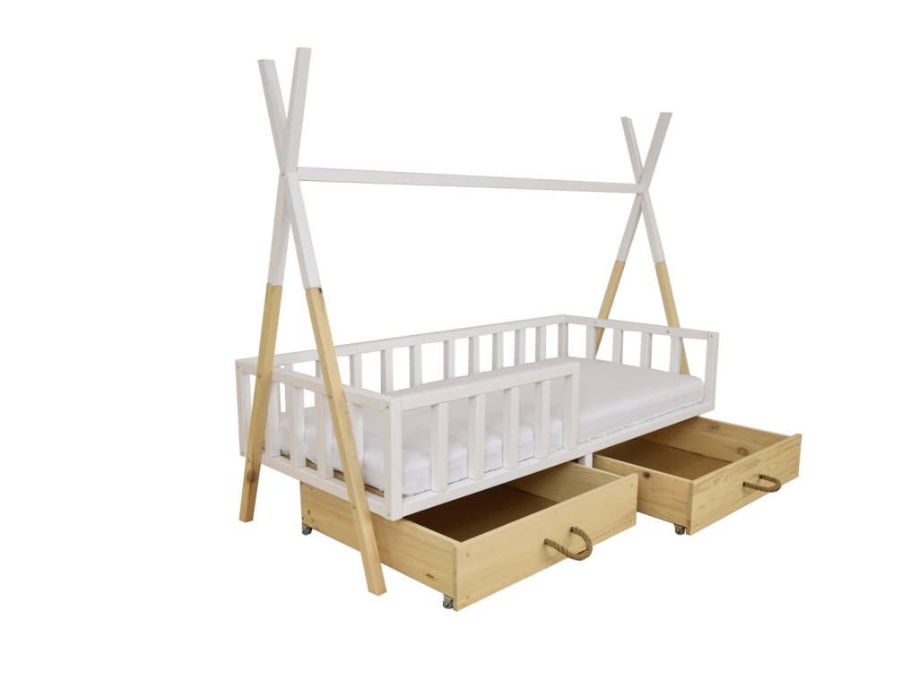 Detská domčeková posteľ Tipi 180x80 sa hodí do interiéru každej detskej izbičky a vaše dieťa si takúto posteľ zamiluje. Posteľ v tvare domčeka môžete ozdobiť krásnymi dekoráciami a vytvoriť tak príjemnú atmosféru v izbičke. Súčasťou postele je ochranná bariéra, ktorá je obojstranná, takže je možné ju namontovať ako ľavú aj pravú. Detská posteľ v tvare domčeka je vyrobená z borovicového dreva potiahnutého tromi vrstvami laku - bezpečné pre deti. V cene postele nie je zahrnutý matrac. Vyberte si ponuky matracov pre deti 180x80 cm.