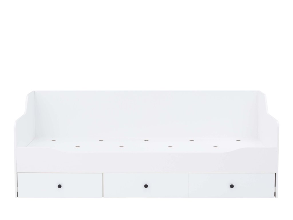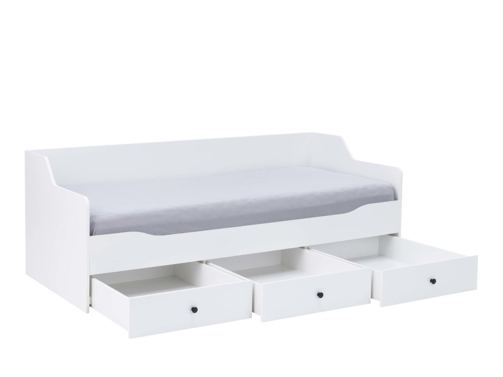 Detská posteľ 90x200 cm sa vďaka svojmu minimalistickému dizajnu hodí do dievčenskej i chlapčenskej izby. Posteľ je vybavená tromi praktickými zásuvkami na posteľnú bielizeň alebo hračky. Cez deň ju môžete používať ako pohovku. Súčasťou postele je rošt vyrobený z 16 mm laminovanej pevnej dosky s ventilačnými prieduchami. V cene postele nie je matrac. Vďaka plnohodnotnému rozmeru tejto jednolôžkovej postele a nosnosti až 100 kg ide o skvelé riešenie pre úsporu miesta v menších bytoch alebo garsónkach. Spolu s dekoračnými vankúšmi vyzerá posteľ ako pohovka a v noci sa na nej komfortne vyspí aj dospelá osoba. Úložný priestor môže cez deň slúžiť na odloženie posteľnej bielizne, prikrývok a vankúšov, v noci zase na uskladnenie opierok či dekoratívnych vankúšov používaných na pohovke.