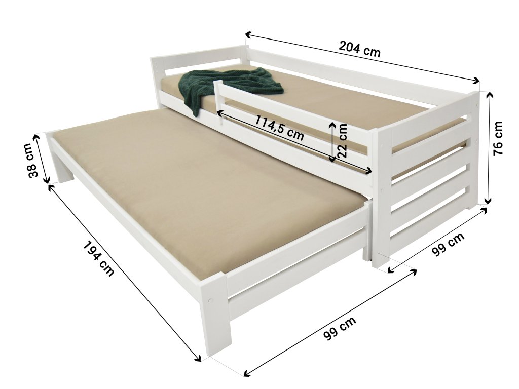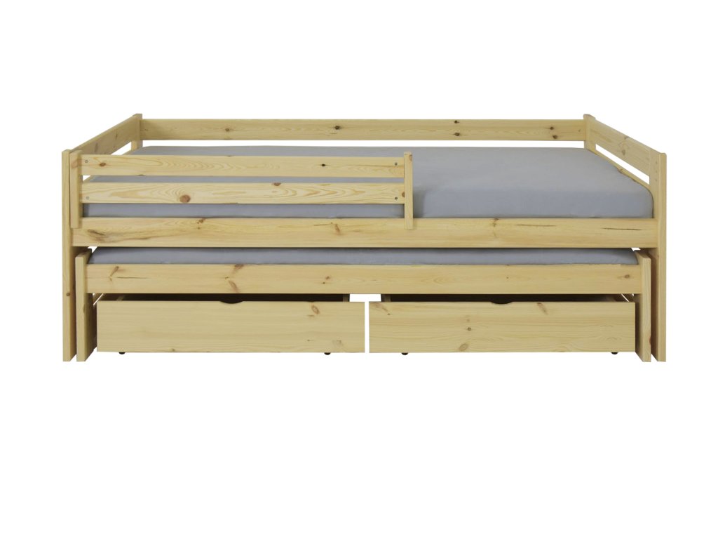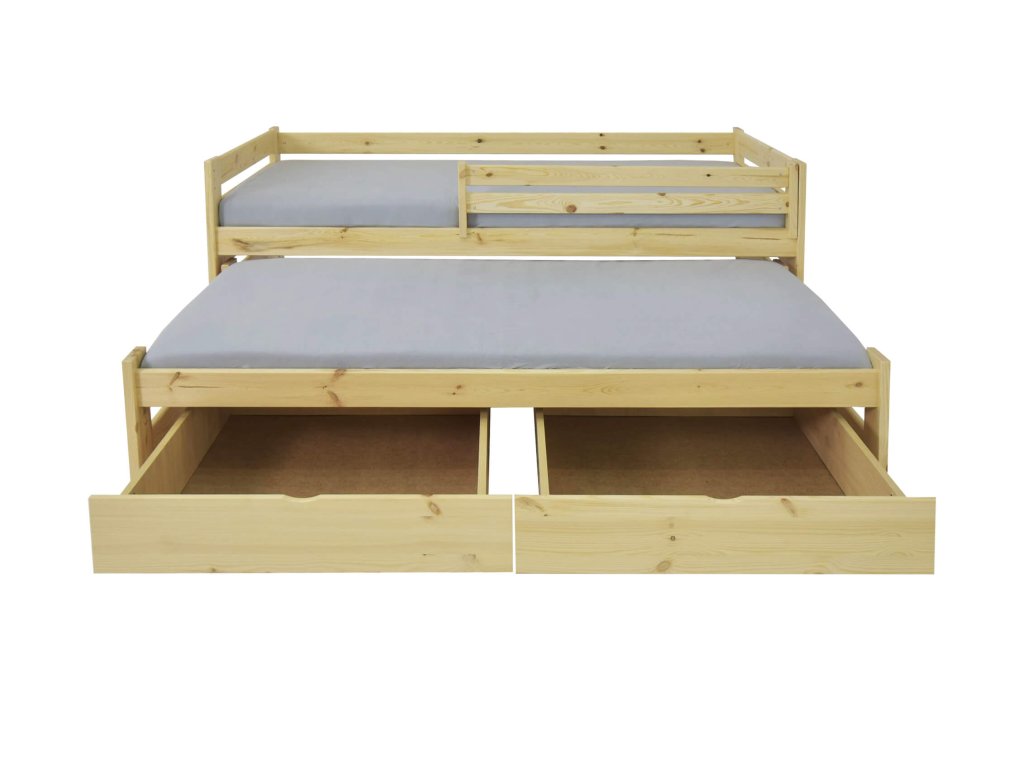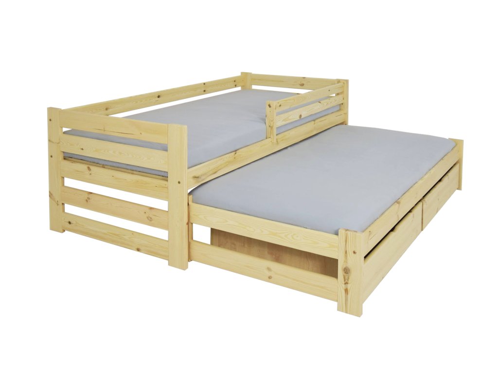 Posteľ Veronika 7 200x90 cm s výsuvnou prístelkou je vyrobená z borovice. Táto posteľ je ideálnou voľbou do malých izieb. Vďaka praktickým úložným boxom ušetríte v izbe veľa miesta. Posteľ je dostupná vo viacerých farebných variantoch a je trikrát lakovaná bezfarebným, ekologicky nezávadným lakom. Posteľ je s 2 úložnými priestormi, ktoré sú na plastových kolieskach, aby nepoškodili podlahu. Nie sú upevnené, čiže je s nimi veľmi ľahká manipulácia. Posteľ je vhodnou voľbou pre každého, kto si potrpí na kvalitu, pretože je vyrobená z masívneho borovicového dreva, a preto bude slúžiť dlhé roky. Bariéra je v cene postele a je odnímateľná. Bariérku je možné namontovať na ľavú aj na pravú stranu. Úložné priestory nevypĺňajú celý priestor pod posteľou. Medzi nohami postele a úložnými boxami je väčšia medzera ako je znázornené na fotografii.