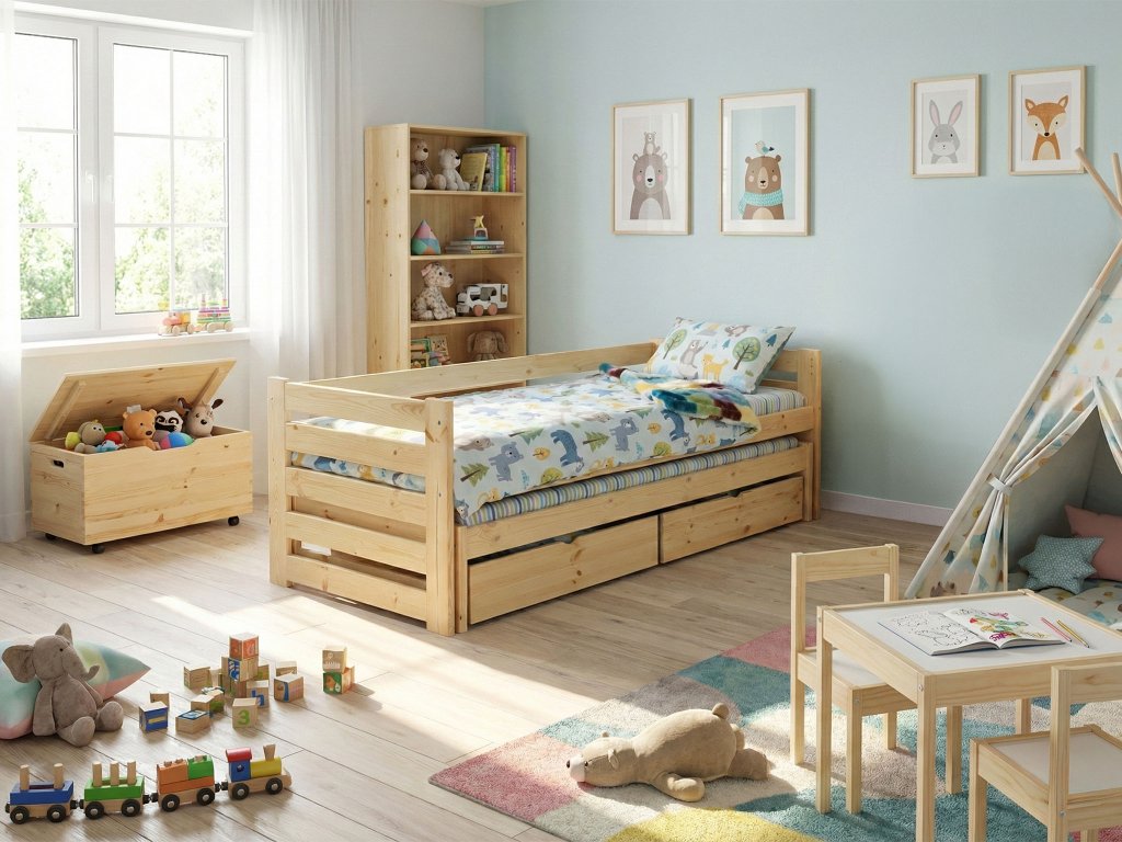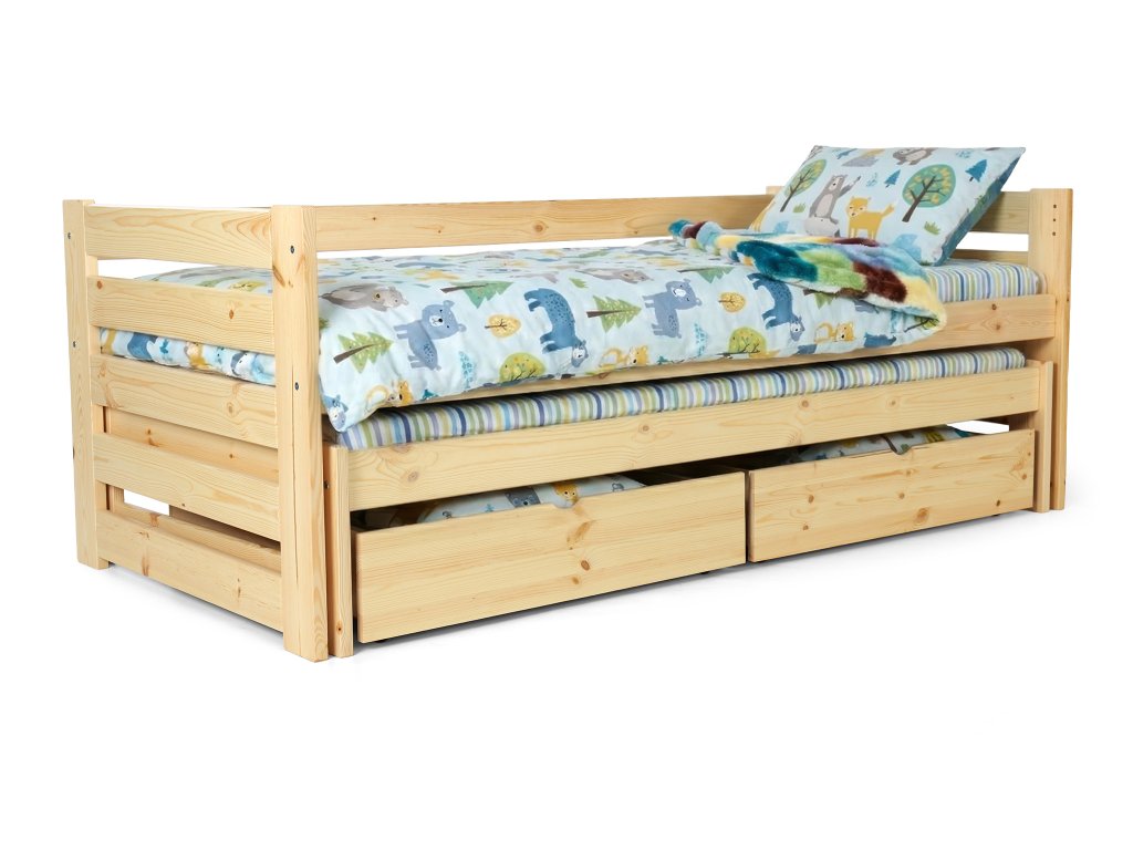 Hľadáte praktické a kvalitné riešenie pre menšiu detskú izbu? Posteľ Veronika 7 s výsuvnou prístelkou a dvoma úložnými boxmi z masívneho borovicového dreva je ideálna voľba do zdieľaných izieb alebo priestorovo úspornej domácnosti.