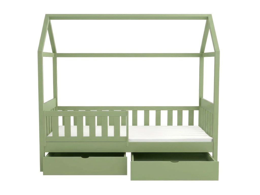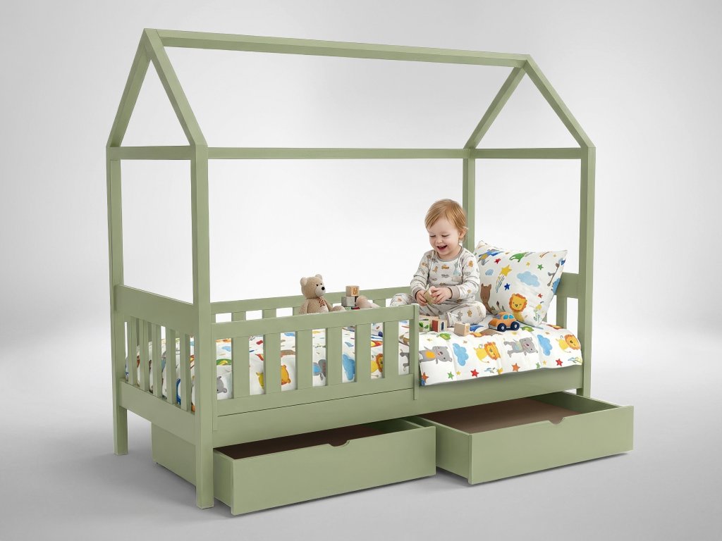 Domčeková posteľ v olivovom prevedení prinesie do detskej izby kúsok prírody a pokojný, harmonický vzhľad. Rozmer 80 × 180 cm je ideálny pre menšie deti, ktorým poskytne pohodlné a bezpečné miesto na každodenný odpočinok. Olivová farba pôsobí nadčasovo a ľahko sa kombinuje s rôznymi štýlmi zariadenia – či už ide o izbičku chlapca alebo dievčatka. Konštrukcia z borovicového dreva zabezpečuje pevnú a stabilnú základňu, ktorá vydrží dlhé roky aktívneho používania. Praktické zásuvky uložené pod lôžkom poskytujú extra úložný priestor na hračky, kreatívne potreby alebo oblečenie. Súčasťou je aj ochranná bariéra, ktorá pomáha udržať dieťa v bezpečí počas spánku a znižuje riziko pádu. Táto olivová domčeková posteľ je skvelým spôsobom, ako vytvoriť útulné miesto na hranie aj odpočinok a zároveň oživiť interiér prírodným tónom.