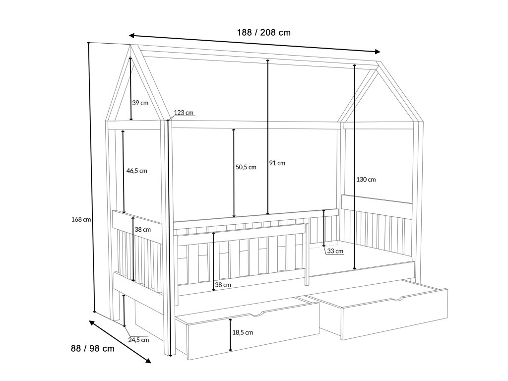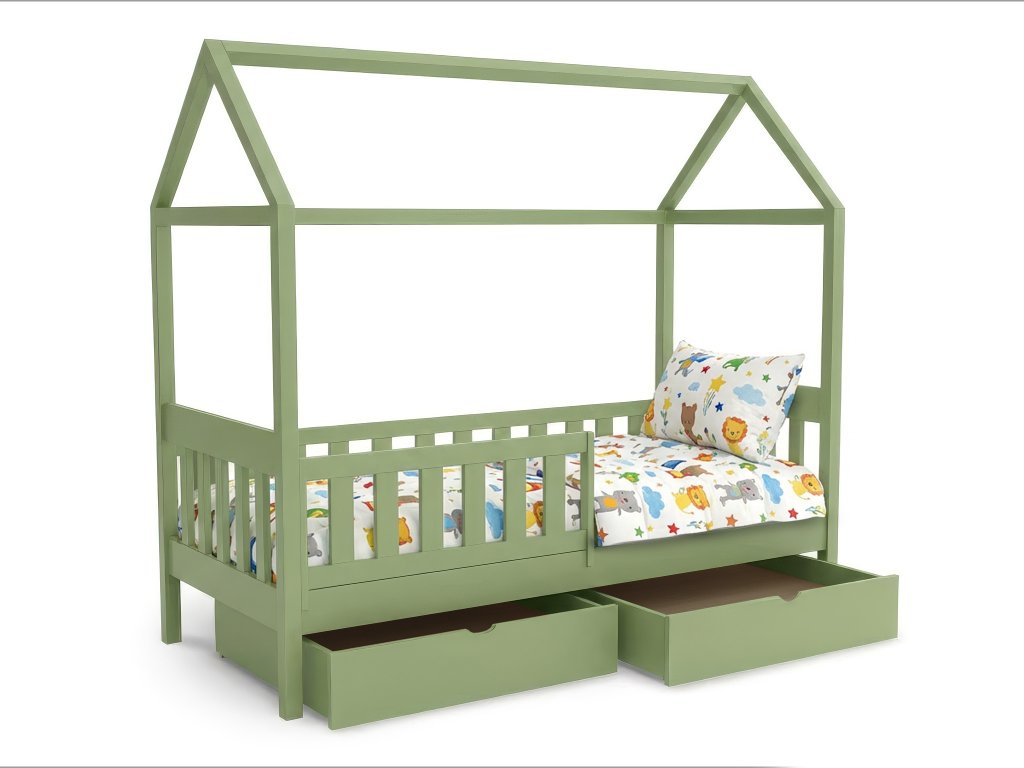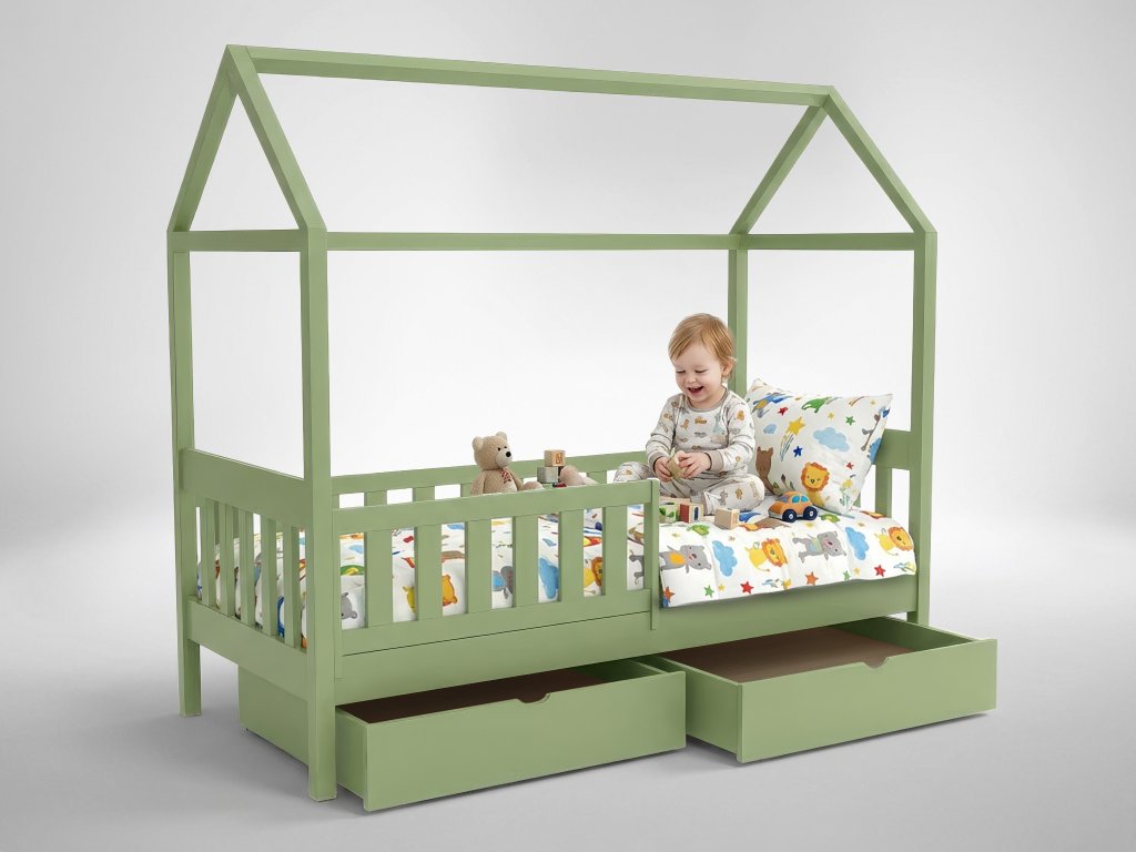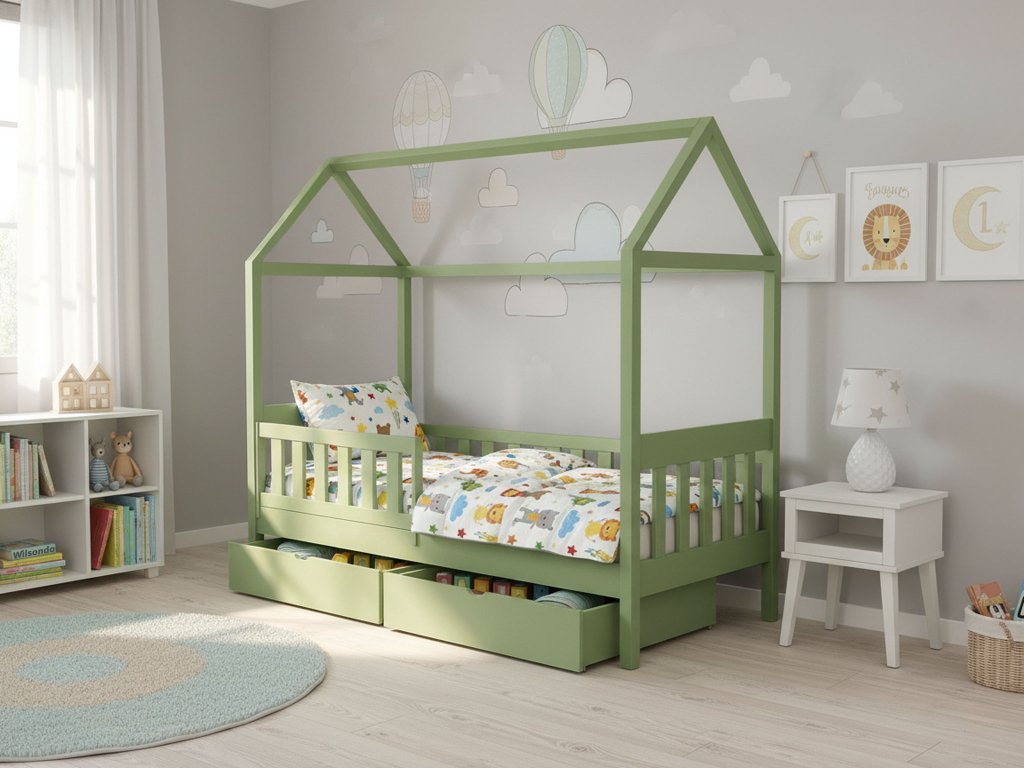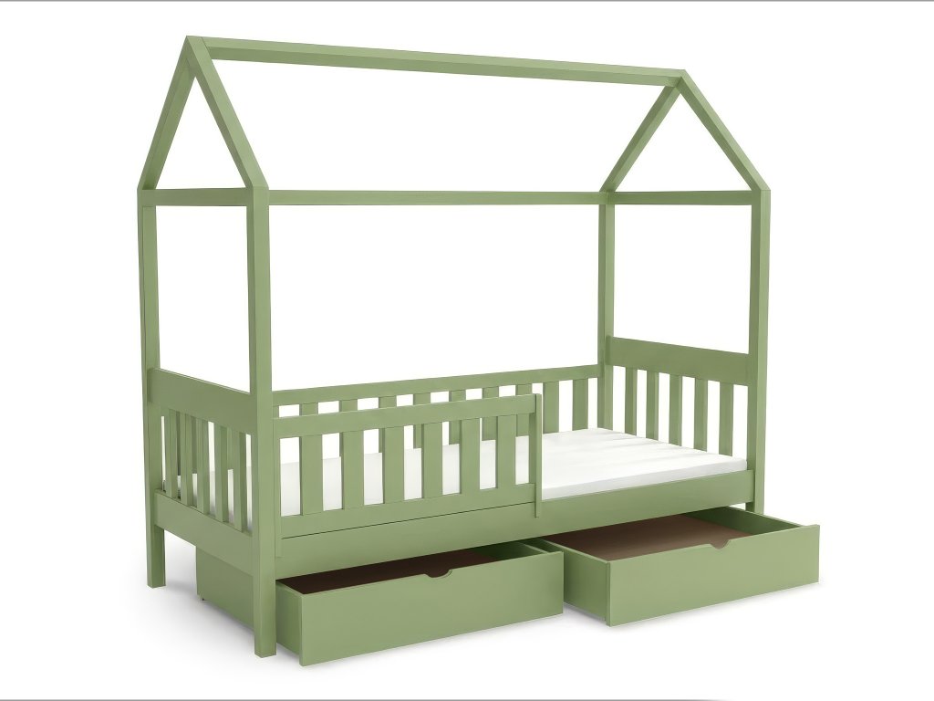 Olivová domčeková posteľ Johny s rozmerom 90 × 200 cm premení detskú izbu na útulné miesto plné fantázie. Jemný prírodný odtieň pôsobí upokojujúco a ľahko zapadne do izbičky každého malého dobrodruha – chlapca aj dievčatka. Vďaka svojmu hravému tvaru domčeka sa posteľ stane obľúbeným miestom nielen na spánok, ale aj na hry a oddych počas dňa. Na výrobu bola použitá kvalitná borovicová masívna konštrukcia, ktorá je známa svojou pevnosťou a stabilitou. Praktické riešenie dopĺňajú dve veľké zásuvky, ktoré poskytnú priestor na ukladaní hračiek, sezónneho oblečenia alebo školských potrieb. Súčasťou konštrukcie je aj bezpečnostná bariéra, ktorá pomáha predchádzať nočným pádom a dodáva rodičom istotu.