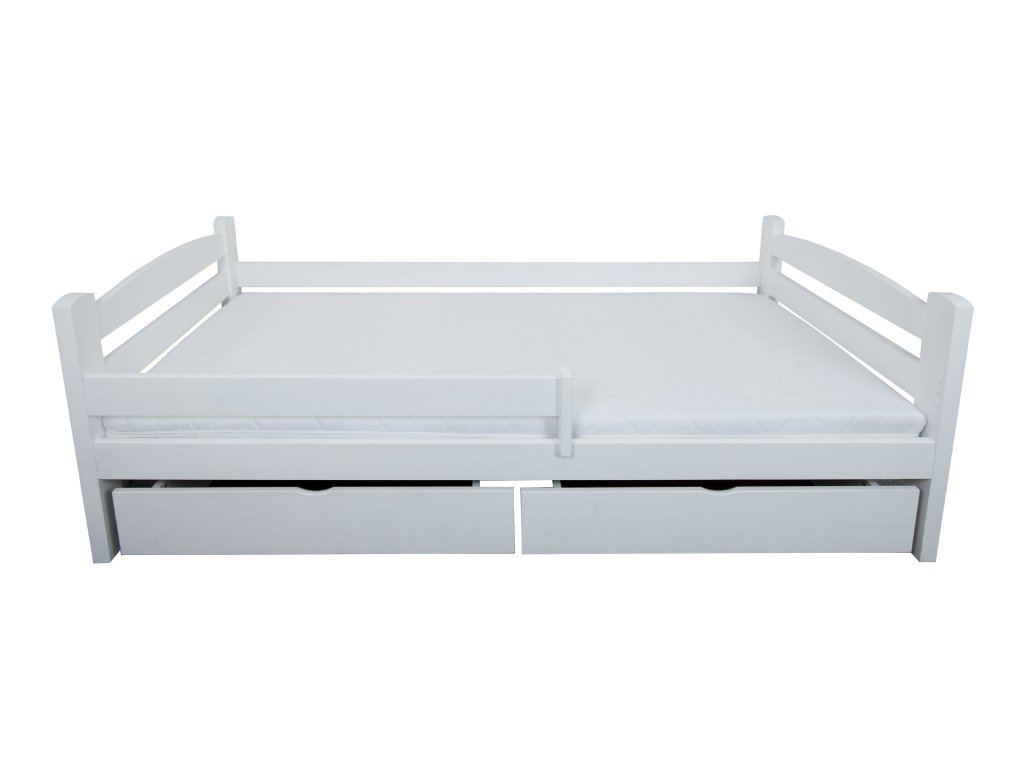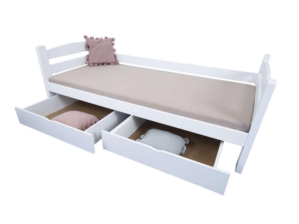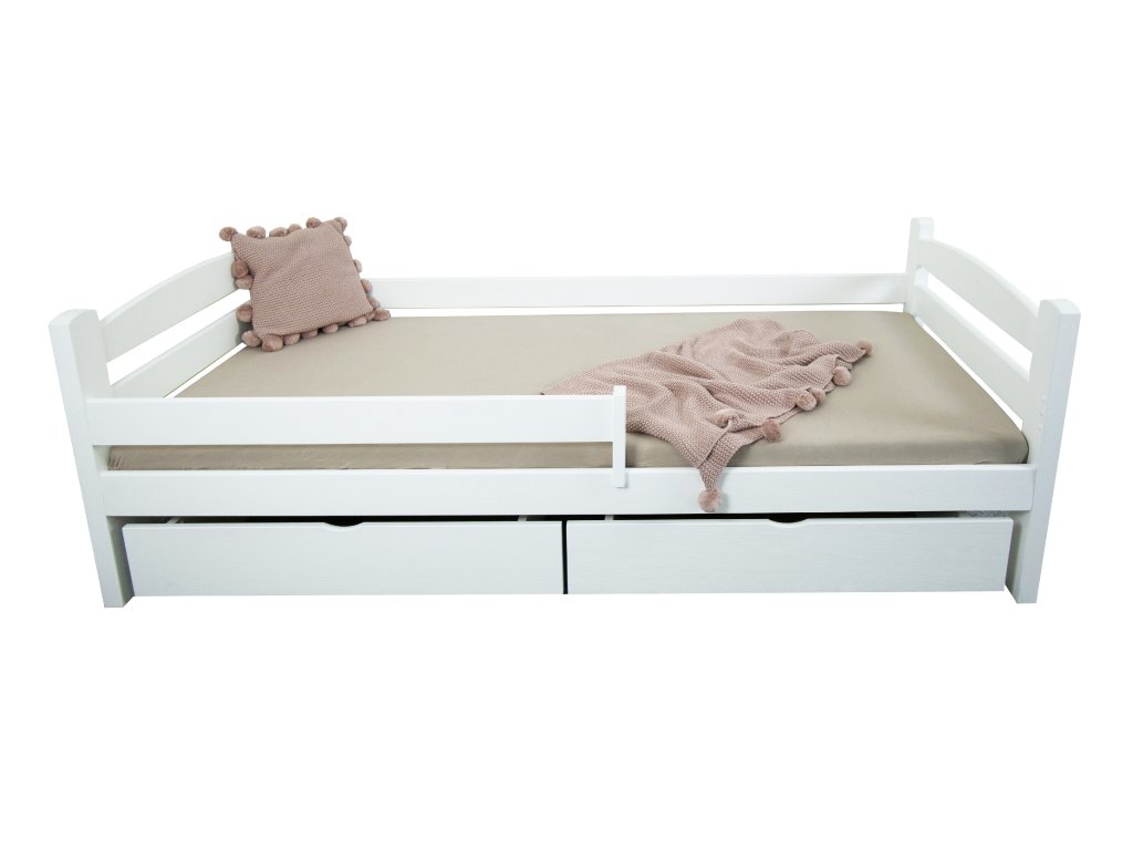 Biela posteľ Oľga 5 200x90 cm je vyrobená z kvalitného masívu borovovice. Výrobok je ošetrený bezfarebným ekologickým lakom. Vďaka použitým materiálom je posteľ vysoko kvalitná a stabilná. Posteľ je dodávaná spolu s roštom a úložnými priestormi. Manipulácia s úložnými boxmi je veľmi jednoduchá, pretože nie sú nijak upevnené k posteli. Posteľ má bezpečnostnú bariéru, ktorá chráni dieťatko pred pádom z postele. Bariérka je odnímateľná, keď dieťatko vyrastie stačí ju jednoducho odmontovať. Súčasťou postele je rošt a bariérka. Bariéru je možné namontovať na obe strany postele. Posteľ nie je dodávana spolu s matracom. Ten si môžete dokúpiť z našej širokej ponuky matracov 200x90 cm.