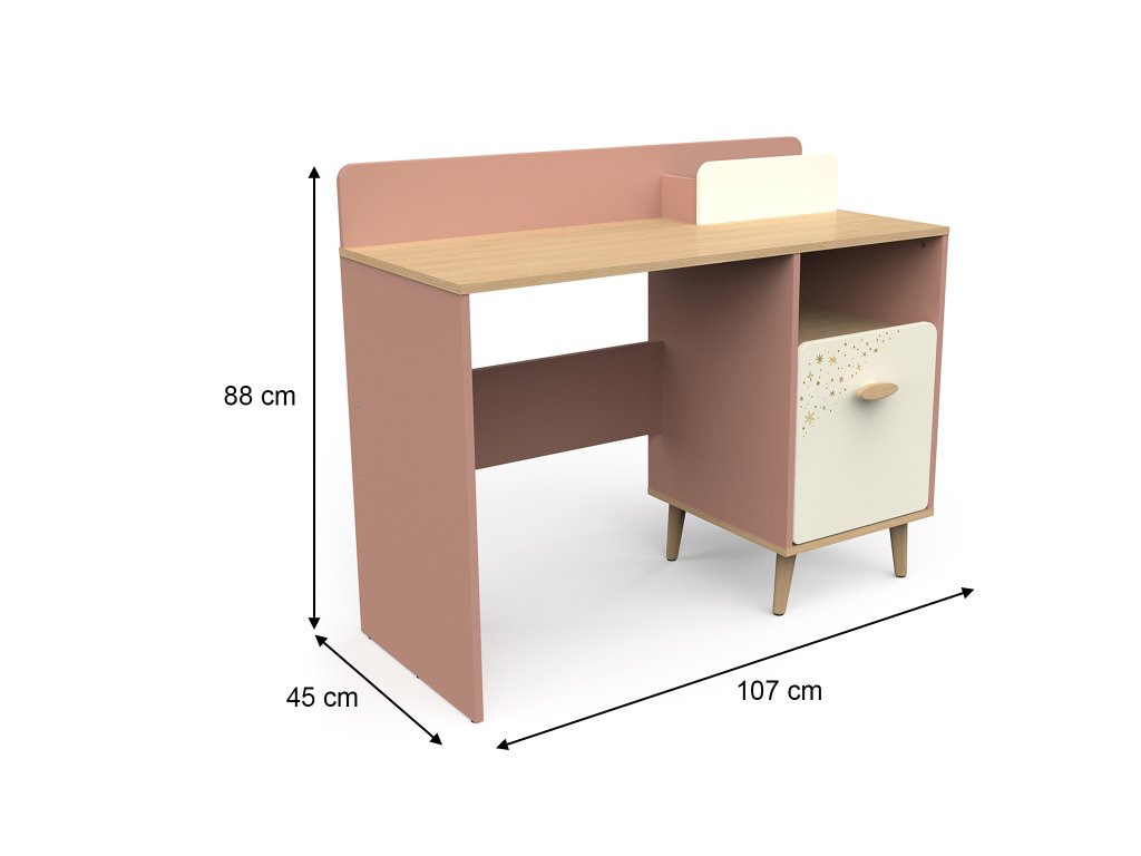 Písací stolík Suzie sa stane obľúbeným miestom každej malej školáčky. Jeho krásne prevedenie v jemnej ružovej a krémovej farbe vnesie do izby príjemnú a radostnú atmosféru. Drevené nožičky z masívneho dubu spolu s kvalitnou konštrukciou zabezpečujú stabilitu a dlhú životnosť stolíka. Na predných dvierkach nájdete milý motív hviezdičiek, ktorý stolíku dodáva rozprávkový vzhľad. Okrem toho stolík ponúka praktický úložný priestor za dvierkami, kde si vaše dieťa môže uložiť školské potreby alebo knihy. Tiež otvorený výklenok ideálny na držiak ceruziek či drobnosti, ktoré potrebuje mať vždy poruke. Horná plocha poskytuje dostatok miesta na písanie, kreslenie, učenie alebo počítač. Detský písací stolík Suzie tak vytvorí útulné a motivujúce miesto pre každodenné povinnosti aj kreatívne chvíle.