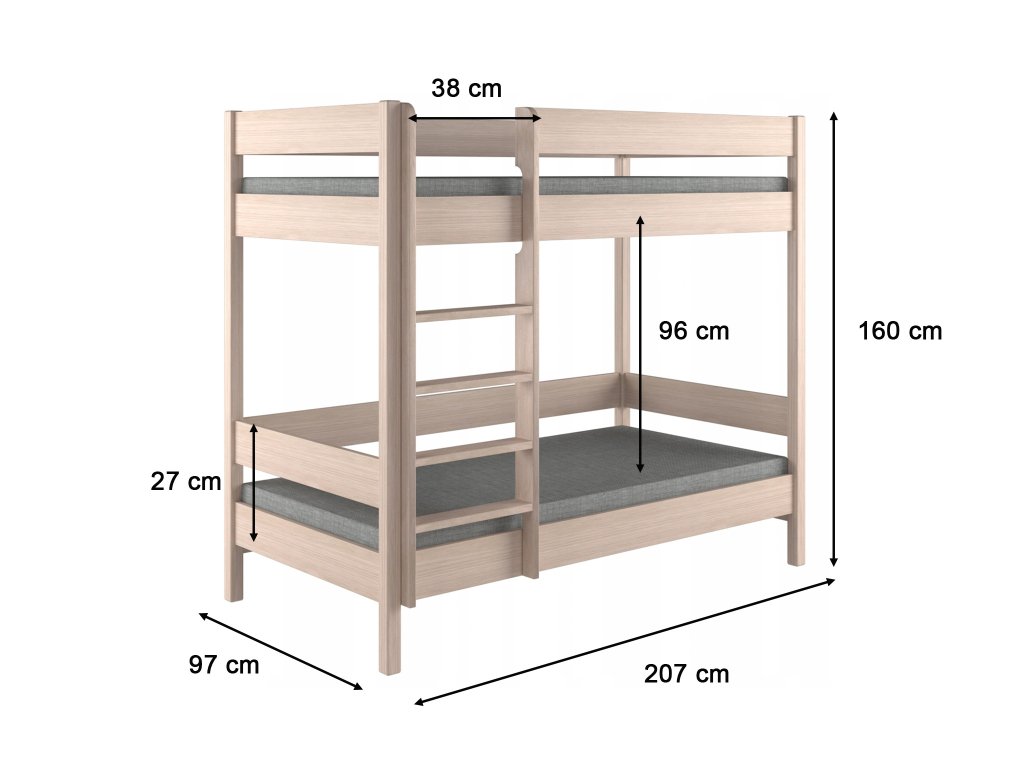 - Materiál postele: rebrík, nohy, spojnice nôh - borovicový masív; boky, rám - DTD