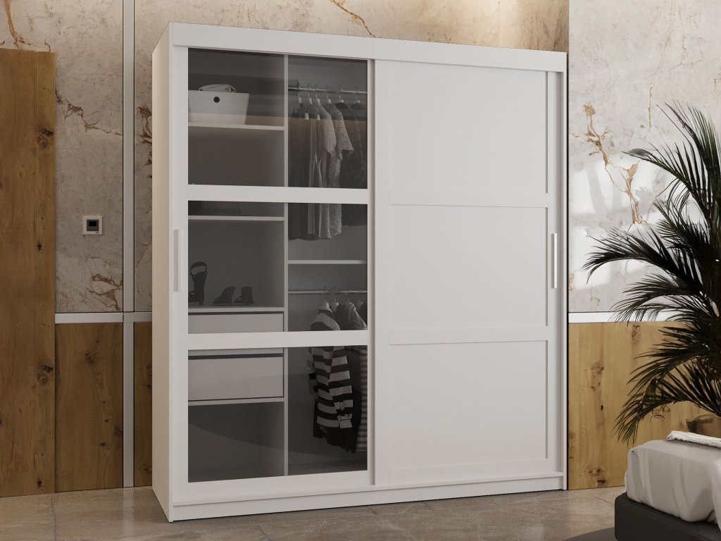 Premeňte svoj interiér na funkčný a elegantný priestor s šatníkovou skriňou Dome 3. Biela farba a kombinácia presklených a drevených posuvných dverí dodávajú priestoru luxusný vzhľad. Strieborný úchyt zvyšuje kontrast a podčiarkuje jej minimalistický dizajn, ktorý sa hodí do každého moderného interiéru.