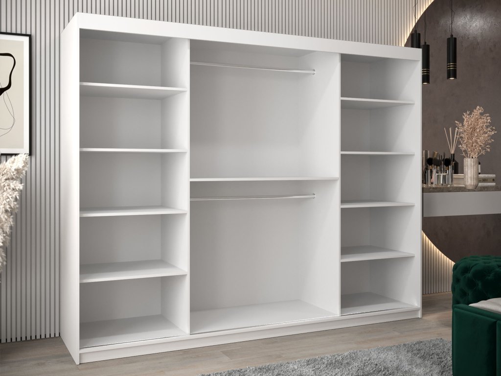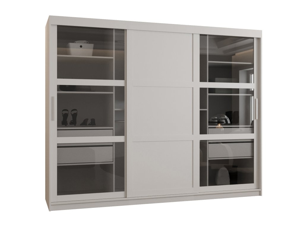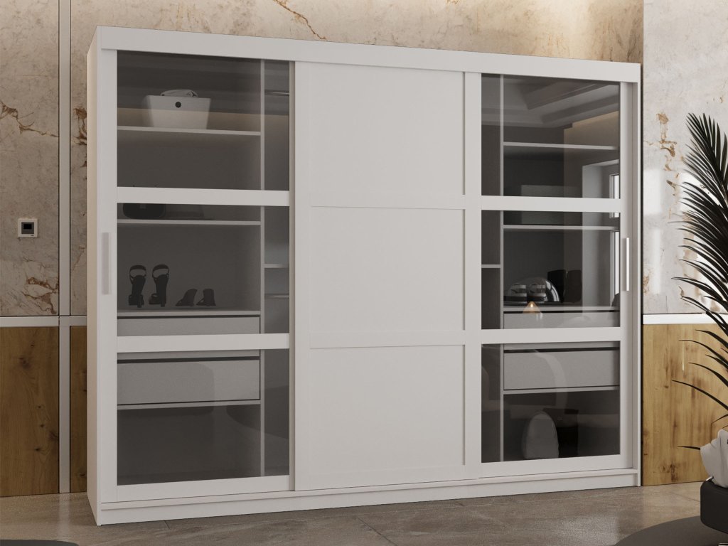 Trojdverová biela šatníková skriňa s posuvnými dverami Dome 3 je ideálnym doplnkom pre väčšie spálne či šatníky. S výnimočnou šírkou 250 cm poskytuje skvelý úložný priestor, ktorý uspokojí aj náročné požiadavky na organizáciu oblečenia, obuvi a doplnkov. Jej elegantné biele prevedenie a kombinácia presklených a drevených posuvných dverí dodávajú moderný a nadčasový vzhľad, ktorý sa hodí do každého interiéru.