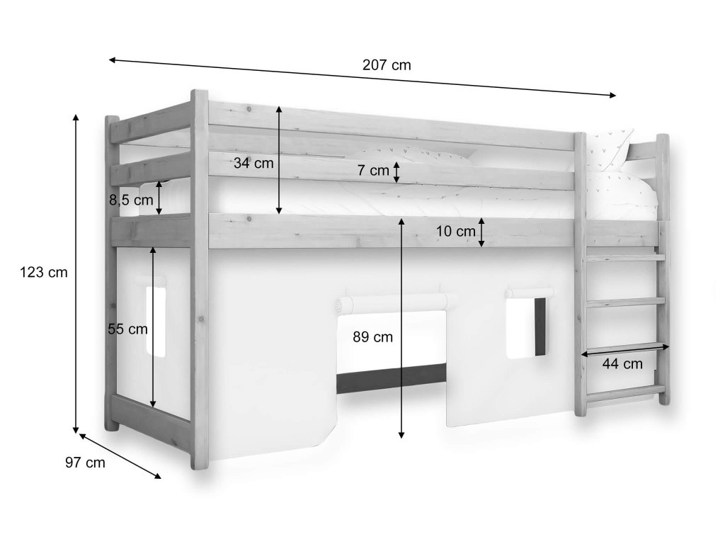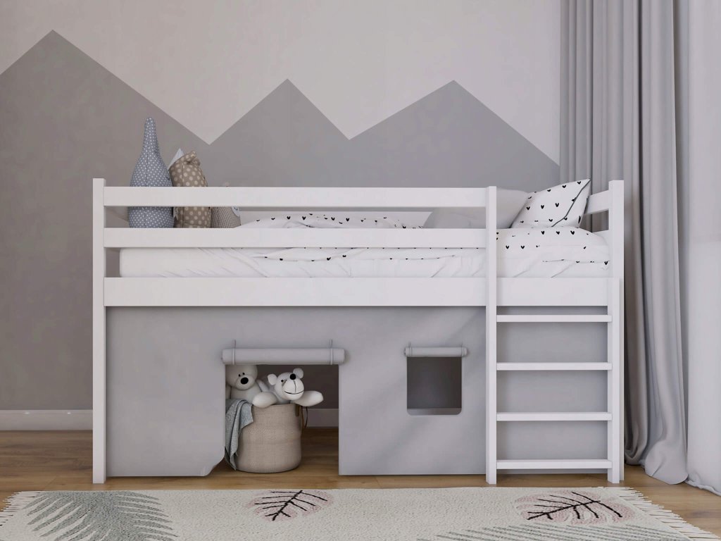 Predstavujeme vám vyvýšenú detskú posteľ Bunkie v elegantnej bielej farbe. Výška postele je dostatočná, aby vaše dieťa mohlo spokojne spať a zároveň sa cítiť ako vlastník svojho vlastného útulného priestoru. Táto posteľ nie je len obyčajným lôžkom, ale ponúka aj miesto pre deti na hranie pod ňou. Pod posteľou sa totiž nachádza dostatočný priestor, kde si môžu vaše deti vytvoriť svoj vlastný svet a hrať sa podľa svojej fantázie. Ak si k posteli dokúpite záclonku, vznikne pod ňou malý domček na hranie. Prípadne vám priestor poslúži na uskladnenie hračiek a iných vecí. Univerzálna pozícia rebríka umožňuje zvoliť si, na ktorej strane postele bude umiestnený, čo robí tento nábytok ešte viac prispôsobiteľným potrebám vašej miestnosti.