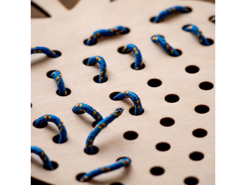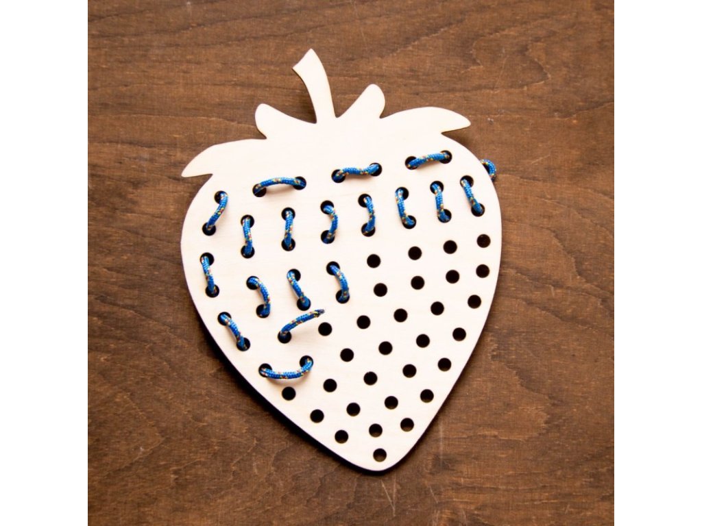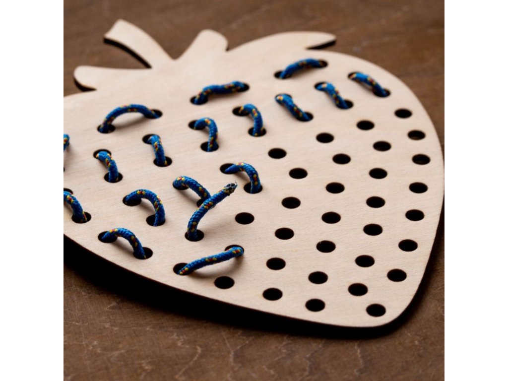 Edukačná pomôcka v tvare jahôdky so šnúrkami trénuje nielen jemnú motoriku, ale tiež trpezlivosť a sústredenie dieťatka. Je dodávaná v prírodnej farbe, ošetrená a prebrúsená. Je určená na dotvorenie farbičkami, najlepšie akrylovými farbami či fixkami – detskej fantázii sa medze nekladú a na skrášlenie šnúrkou, ktorú postupne prevlieká cez predchystané dierky. Hračka je vhodná aj ako praktický darček pre tých najmenších. Vyrobené z FSC certifikovanej preglejky.