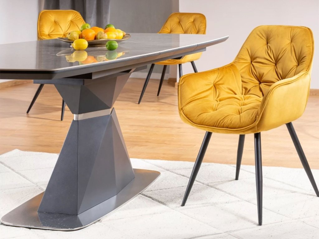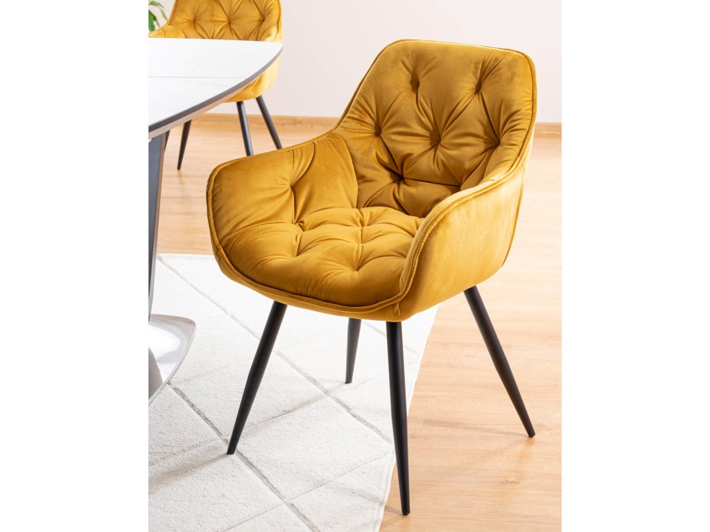 Jedálenská stolička Bria vyniká svojim moderným dizajnom a mierne zaoblenými hranami. Má stredne vysoké tvarované operadlo s podrúčkami, vďaka ktorým bude sedenie na stoličke ešte komfortnejšie. Ozdobne prešívaná stolička je čalúnená zamatovou látkou, ktorá je mimoriadne estetická a navyše jemná na dotyk. Látka má veľmi dobrú odolnosť voči oderu, žmolkovaniu a veľmi ľahko sa udržuje v čistote. Stolička stojí na kovových nohách čiernej farby. Vďaka spomínanému modernému dizajnu viete stoličku umiestniť nie len do jedálne, ale aj obývacej izby kde zaručene vynikne.