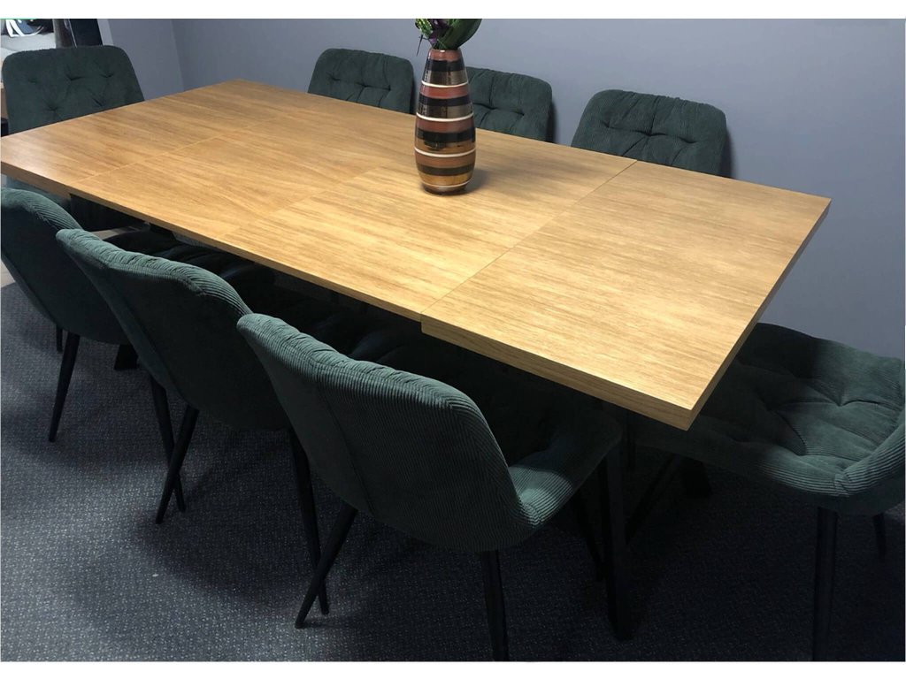 Naša ponuka stoličiek do jedálne zahŕňa kúsky, ktoré sú nadčasové a univerzálne. Je možné ich použiť aj v iných častiach vašej domácnosti. Stolička DEJNA v zelenej farbe je vhodnou alternatívou do jedálne, ale aj do pracovne či izby pre študenta. Skladá sa z menčestrovej látky v tmavej zelenej farbe, ktorá oživí a upúta hostí. Konštrukcia sa skladá z kovu, ktorý je v čiernej farbe. Kombinácia menčestru spolu s čiernou farbou dodá stoličke dôraz a výraznosť. Sedadlo aj operadlo je prešívané jemným vzorom a je mäkké, čo vám poskytne dlhodobé a komfortné sedenie počas práce či pri učení.