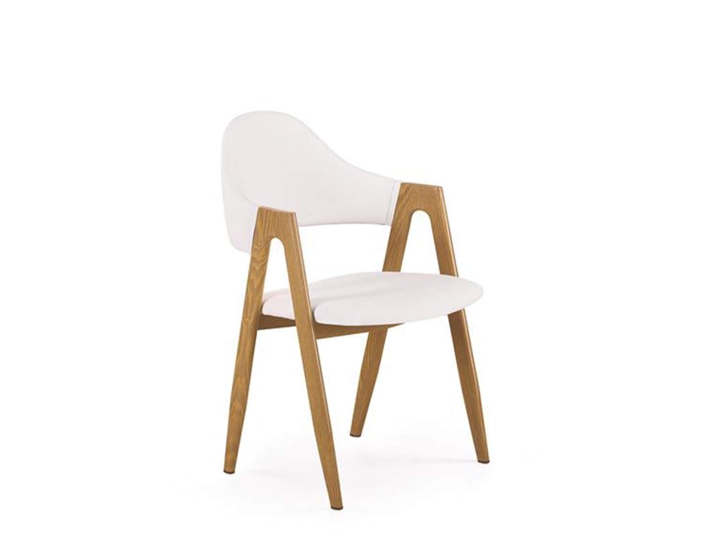 Štýlová jedálenská stolička K247 bude skvelou voľbou k jedálenskému stolu. Kvalitné materiály, z ktorých je vyrobená zaručia jej dlhodobú životnosť. Očarí svojím originálnym tvarom nožičiek, ktoré slúžia tiež ako podrúčky. Stolička má konštrukciu vyrobenú z práškovej ocele v dekore medový dub. Sedadlo a operadlo je čalúnené kvalitnou ekokožou v bielom prevedení. Údržba stoličky je veľmi jednoduchá, stačí pretrieť vlhčenou handričkou. Moderný dizajn stoličky sa bude skvelo vynímať vo vkusne zariadenej domácnosti, kaviarni, alebo v reštaurácií.