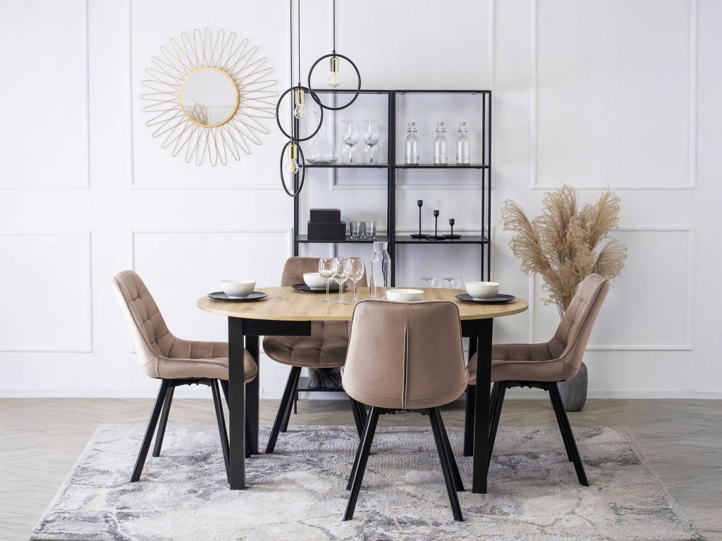 Stolička Notti v tmavobéžovej farbe ponúka elegantný zamatový poťah, stabilnú kovovú konštrukciu a štýlové prešívanie – ideálna do modernej jedálne. Jemne prešívaný velúr dodáva stoličke elegantný charakter, ktorý zaujme už na prvý pohľad. Stabilné čierne kovové nohy zaručujú dlhú životnosť a spoľahlivosť, zatiaľ čo mäkké čalúnenie ponúka pohodlie pri každom sedení. Či už ide o rodinné stolovanie, prácu z domu alebo chvíle oddychu, Notti vždy poskytne komfort a štýl. Ľahká a praktická konštrukcia umožňuje jednoduché premiestňovanie, čo oceníte najmä v menších priestoroch. Táto stolička oživí každú miestnosť svojím moderným a zároveň útulným vzhľadom. Stolička je otočná o 180° (stupňov).