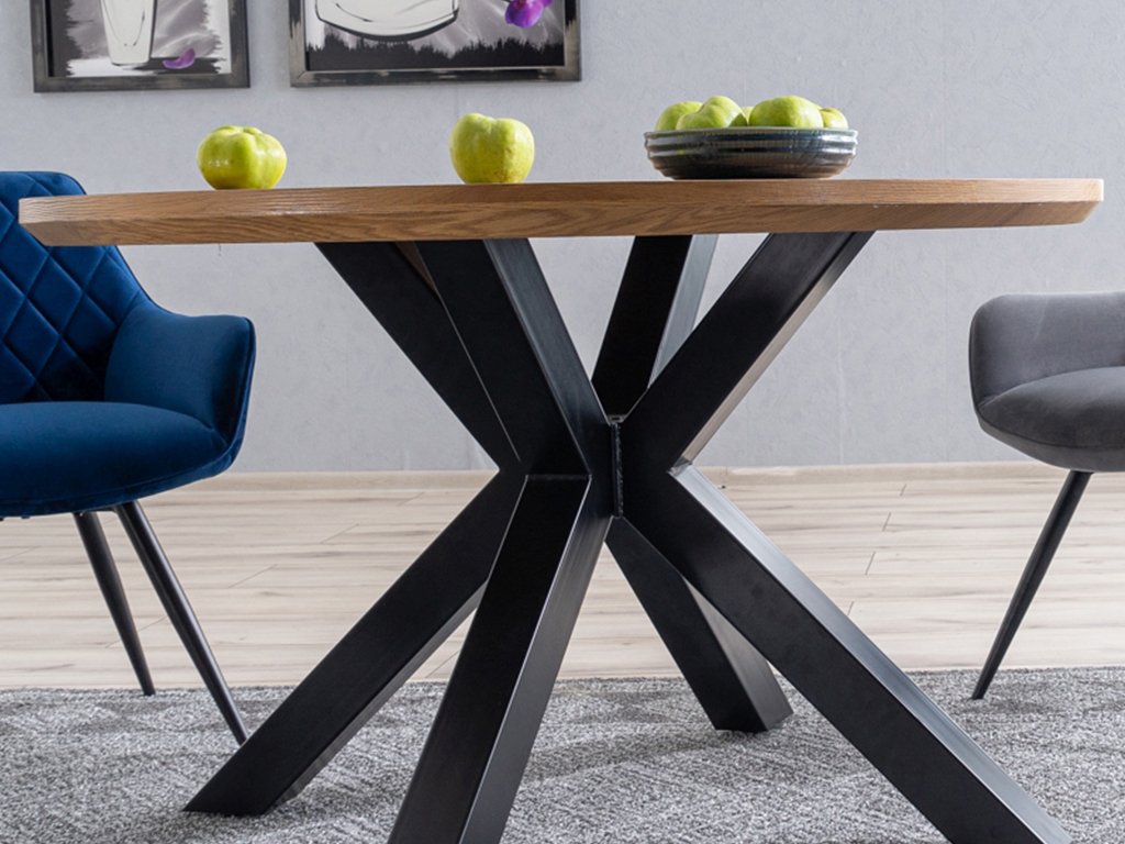 Okrúhly jedálenský stôl Tristan je praktický stôl do kuchyne alebo jedálne. Vďaka okrúhlemu tvaru šetrí miesto a zútulní každý priestor. Vrchná doska je vyrobená z kvalitnej dyhovanej MDF, ktorá vytvára nádherný prírodný dojem. Zaujímavo riešená podnož z kovu v čiernej farbe zabezpečí stabilitu a tento jedálenský stôl bude zaručene dominovať vo Vašom interiéri a spríjemní Vám chvíle stolovania.