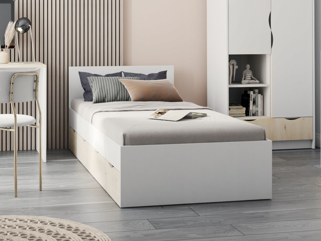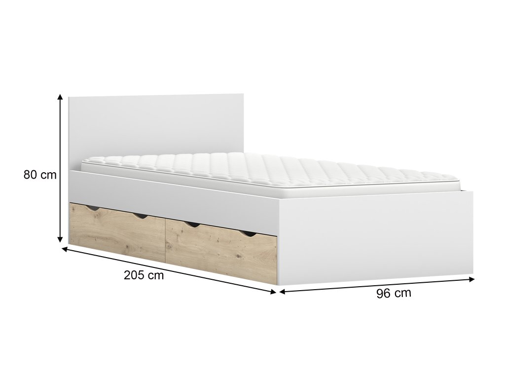 Jednolôžková posteľ s úložným priestorom Joy predstavuje ideálne riešenie pre detské a študentské izby. Vďaka svojmu jednoduchému a modernému dizajnu v kombinácii bielej farby a dubu artisan zapadne do rôznych interiérov a zároveň vytvorí útulnú a usporiadanú atmosféru. Lôžko s rozmerom 90 × 200 cm poskytuje komfortný priestor na spanie pre jedno dieťa či tínedžera. Oceniteľnou súčasťou sú dve hlboké zásuvky, ktoré ponúkajú praktické riešenie na uloženie posteľnej bielizne, sezónneho oblečenia alebo hračiek.