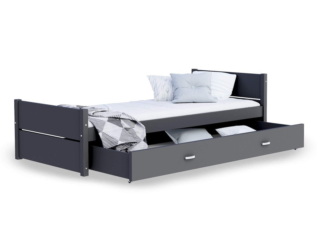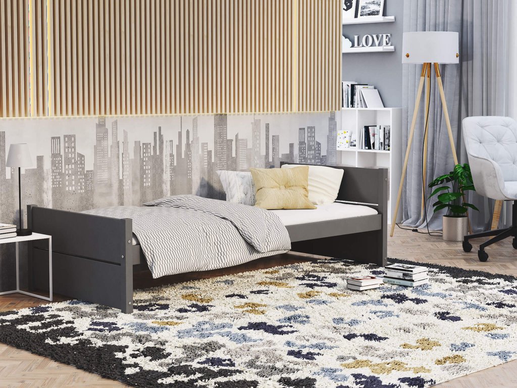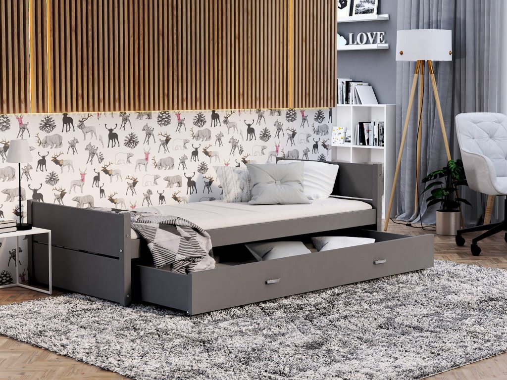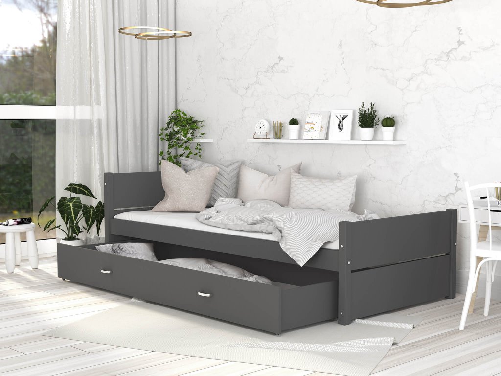 Posteľ 90x200 pre deti i tínedžerov DANTE spája odolnosť a pevnosť so zaujímavým dizajnom. Všetky hračky, deky, sezónne oblečenie či posteľnú bielizeň hravo uschová úložný box na kolieskach. Posteľ je vyrobená z kvalitnej a odolnej MDF dosky. Tá sa navyše ľahko udržiava a čistí. Spojenie postele kladivovými skrutkami zaručuje vysokú pevnosť a stabilitu postele.Nohy postele sú z masívu. Vďaka jej štýlovému dizajnu ju môžete použiť v rôznych interiéroch detskej, študentskej či hosťovskej izby. Flexibilný lamelový rošt vyrobený z kvalitného masívneho dreva poskytuje maximálne pohodlie počas spánku, nakoľko zvyšuje pružnosť a komfort matraca. Posteľ je ošetrená lakom na vodnej báze, ktorý je bez zápachu a je bezpečný pre detské výrobky.