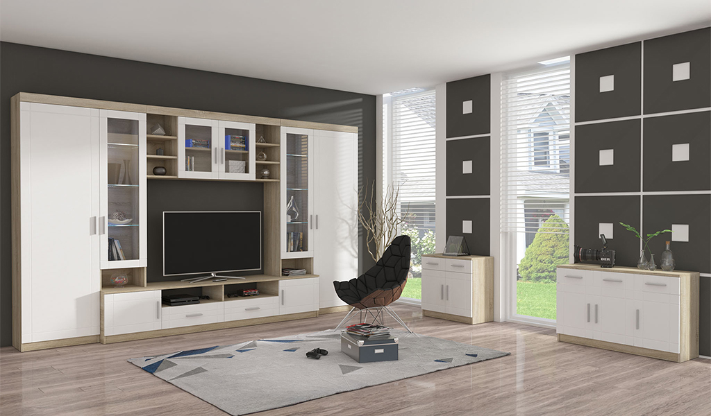 Kolekcia Aris je skvelou voľbou pre moderný interiér. Je vhodná na umiestnenie do obývacieho priestoru, ale všetko závisí na vašich prefereniách. Súčasťou kolekcie sú komody v dvoch odlišných rozmeroch a kompletná obývacia stena. Nábytok je nadizajnovaný v troch farebných predeveniach - v grafitovej, v dekore dubu sonoma a klasickej bielej farbe. Vďaka tomu sa nemusíte obávať možnej kombinácie s ostatným nábytkom vo vašej domácnosti. Samostané kusy nábytku sú z odolnej laminovanej dosky so zvýšenou ochranou proti poškodeniu. Obsahujú pevné plastové úchytky. S kolekciou Aris získate nielen štýlové, ale zároveň aj funkčné riešenie do vašej domácnosti.
