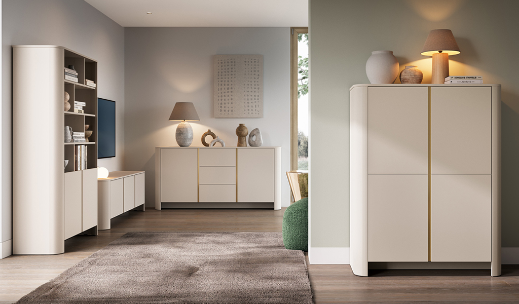 Kolekcia do obývačky BORI vnáša do bývania súčasný štýl postavený na čistote tvarov a premyslených detailoch. Nábytok zaujme mäkkými, plynulými líniami a korpusom, ktorý namiesto tradičných nôh stojí na elegantnom sokli. Celok pôsobí stabilne, kompaktné siluety vytvárajú harmonický a vizuálne vyvážený dojem. Na výrobu sú použité kvalitné MDF dosky a laminovaná drevotrieska doplnená o odolné ABS hrany, čo zabezpečuje pevnosť a trvácnosť jednotlivých prvkov.