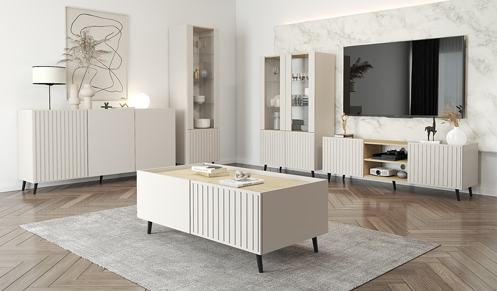Predné plochy sú frézované a doplnené o bezúchytkový systém, ktorý zvýrazňuje minimalistický charakter kolekcie. Celkový vzhľad podčiarkujú čierne kovové nohy s moderným dizajnom.