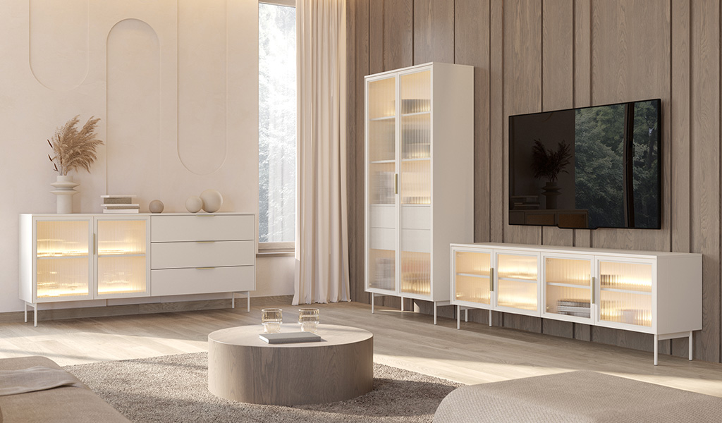 Kolekcia LIMU prináša do obývačky nadčasovú eleganciu spojenú s praktickým využitím moderného bývania. Dostupná je v dvoch elegantných farebných prevedeniach – teplý dub Dunin, ktorý dodáva interiéru prirodzený charakter, a moderný kašmír, ktorý pôsobí jemne a moderne. Kolekcia obsahuje niekoľko kusov nábytku - vysokú vitrínu, dve komody a praktický TV stolík.