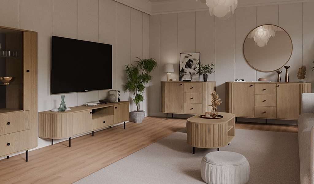Ovalio ponúka širokú škálu prvkov – vitrínu, komody, TV stolík a konferenčný stolík – ktoré umožňujú vytvoriť funkčný a esteticky zladený priestor presne podľa vašich potrieb. Pre ešte útulnejšiu atmosféru môžete interiér doplniť mäkkým kobercom, závesmi, dekoráciami alebo dekou, ktoré zvýraznia krásu oboch farebných prevedení.