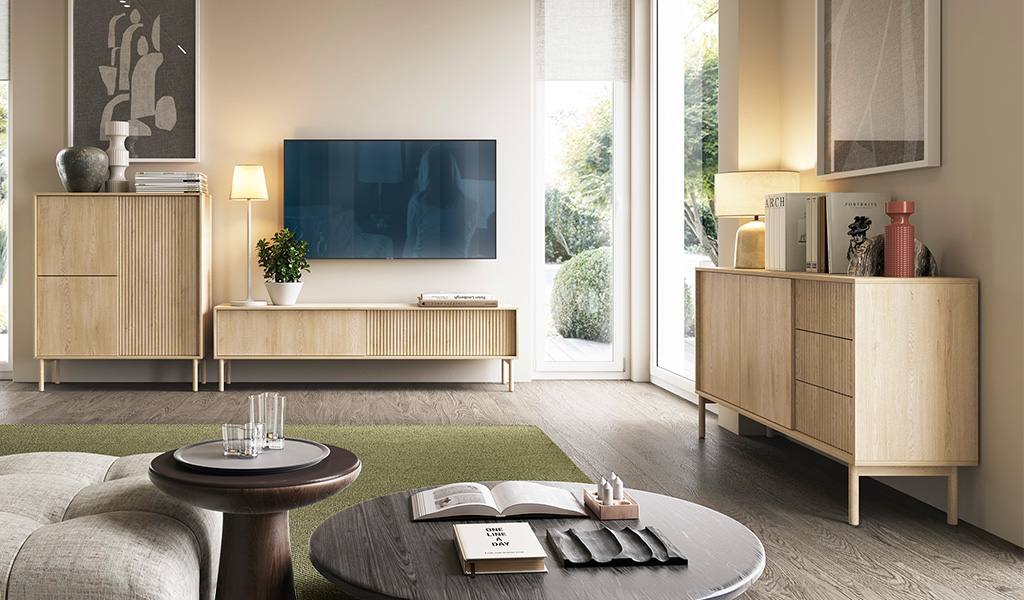 Kolekcia obsahuje vysokú komodu, dve komody v rôznych veľkostiach, TV stolík v niekoľkých variantoch a nočný stolík, vďaka čomu si môžete vytvoriť harmonický a funkčný priestor presne podľa svojich predstáv. Stačí už len pridať vašu pohodlnú sedaciu súpravu.