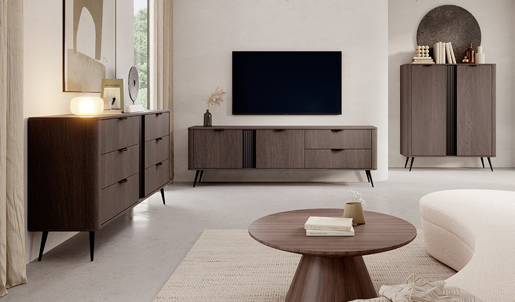 Kolekcia Veris prináša štýlový a moderný nábytok do vašej obývačky. Obsahuje niekoľko praktických a elegantných kusov – TV stolíky, komody rôznych veľkostí, vitrínu a dokonca aj nočný stolík.