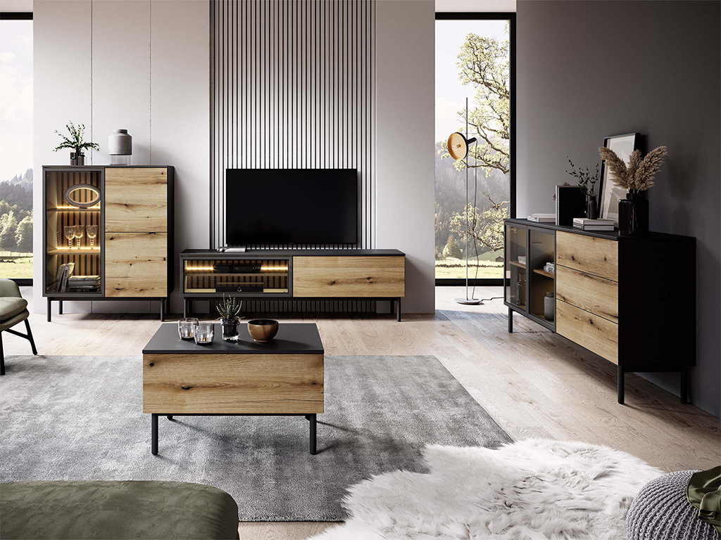 Dizajnová obývacia izba Torro v prírodnom dekore dub Cremona, doplnená o čierne detaily