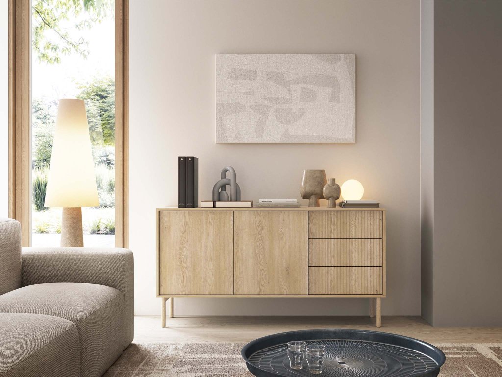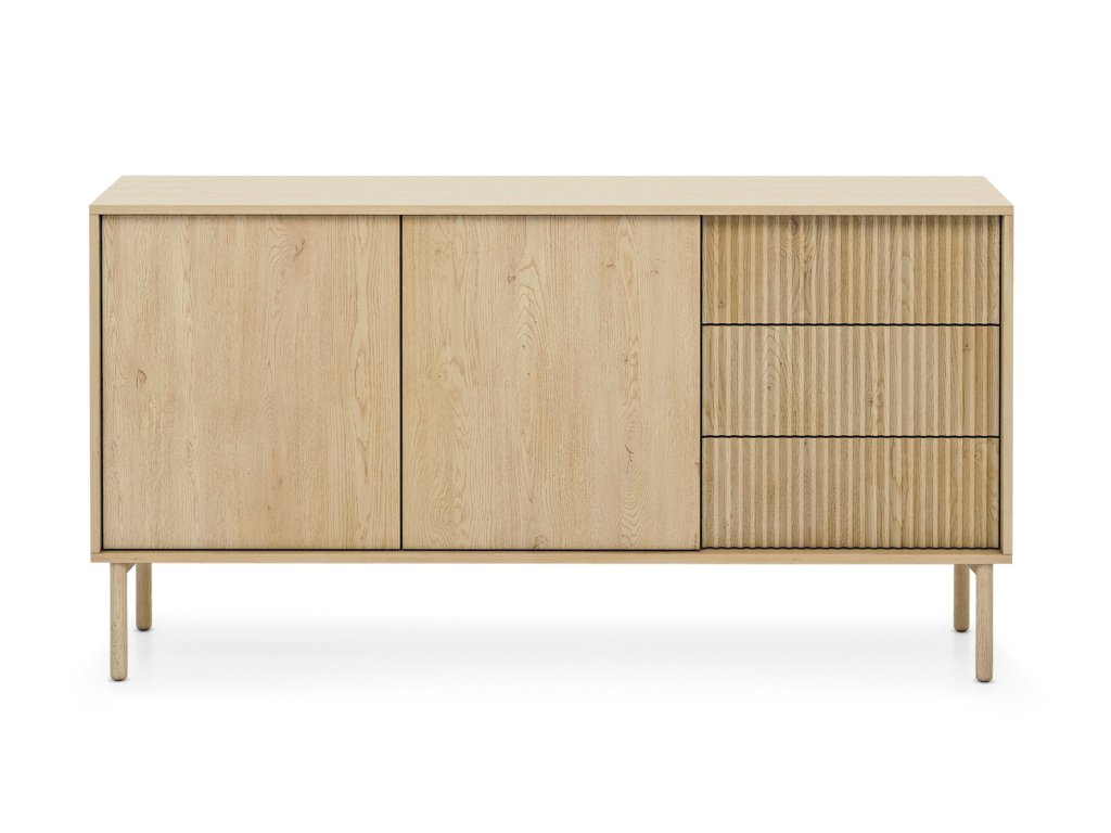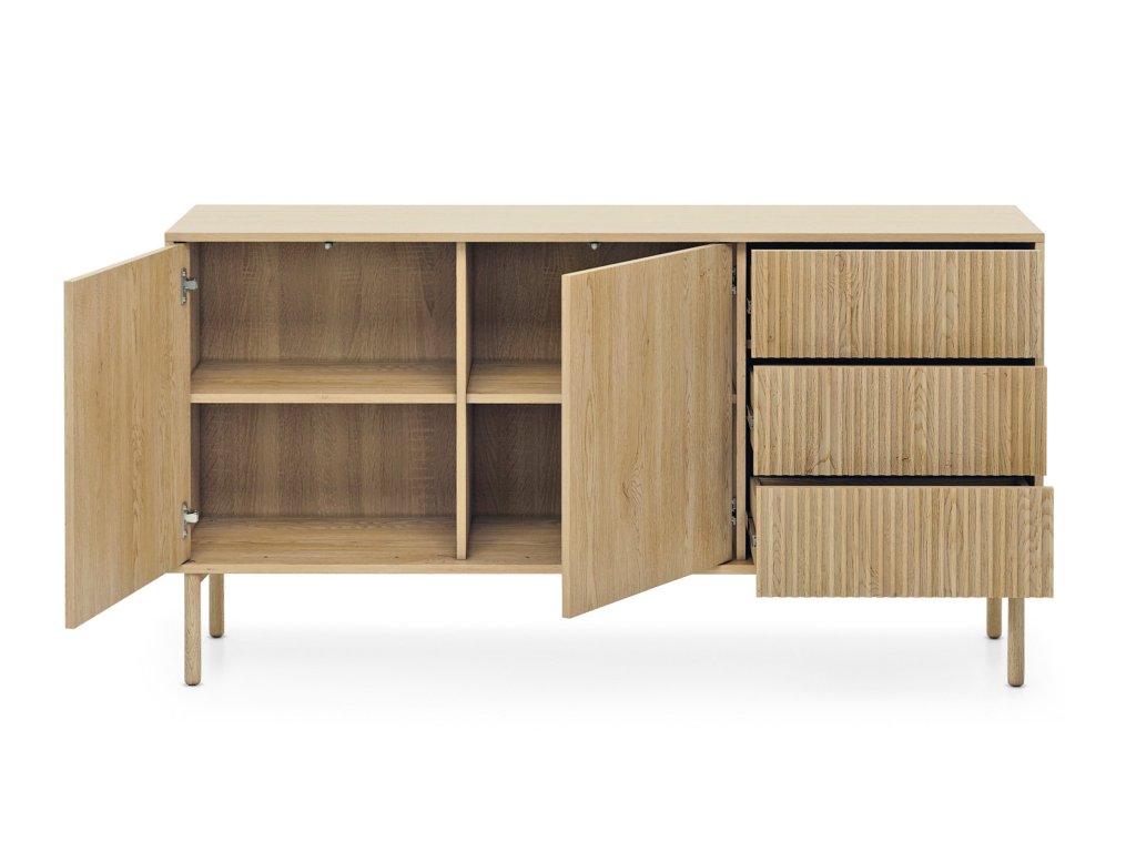 Široká komoda 2D3S Tavo spája moderný dizajn s praktickým využitím. Pevné drevené nožičky zaisťujú stabilitu a uľahčujú údržbu podlahy. Drážkované čelá z MDF dosiek s precízne opracovanými ABS hranami zaručujú odolnosť a nadčasový vzhľad, ktorý vydrží každodenné používanie.