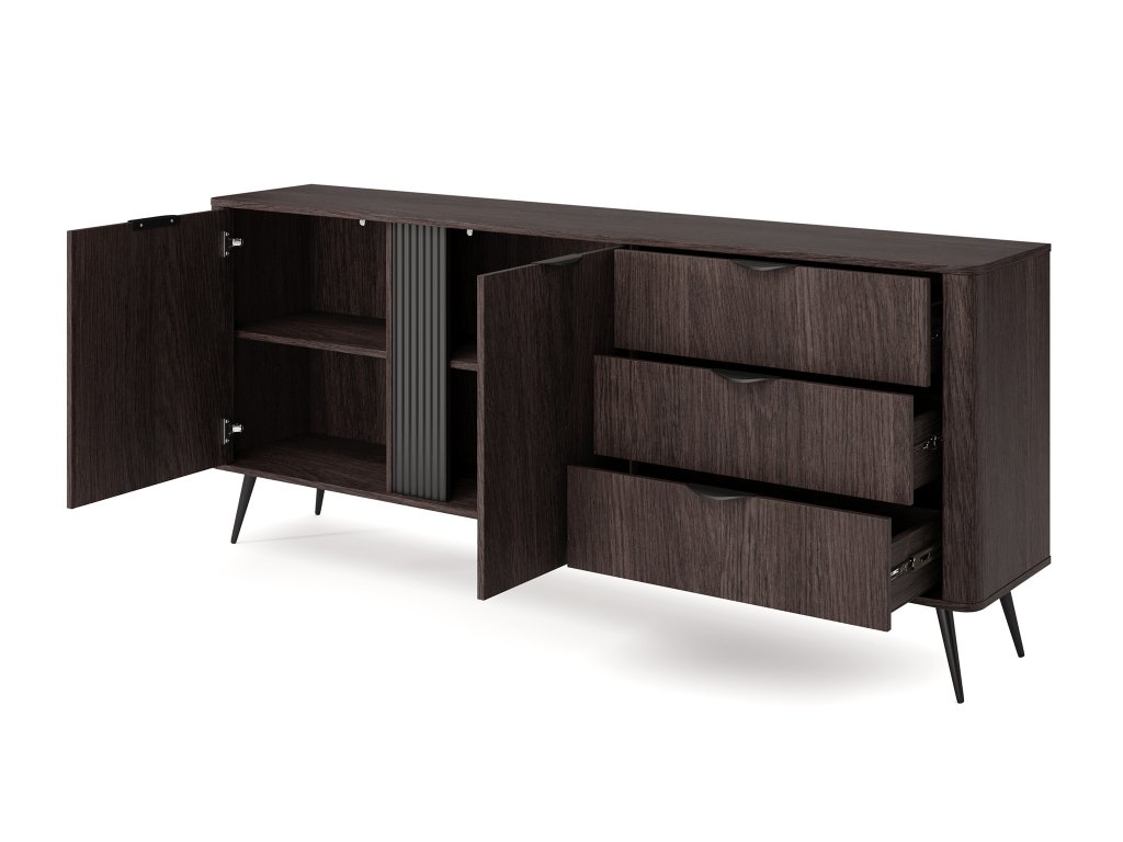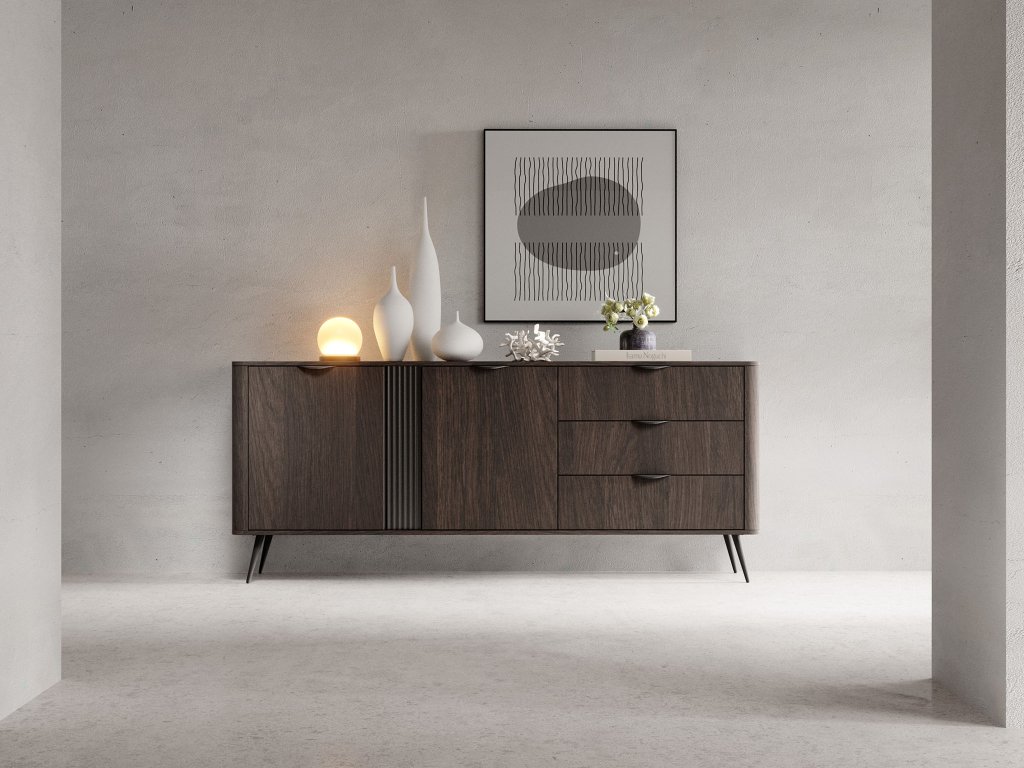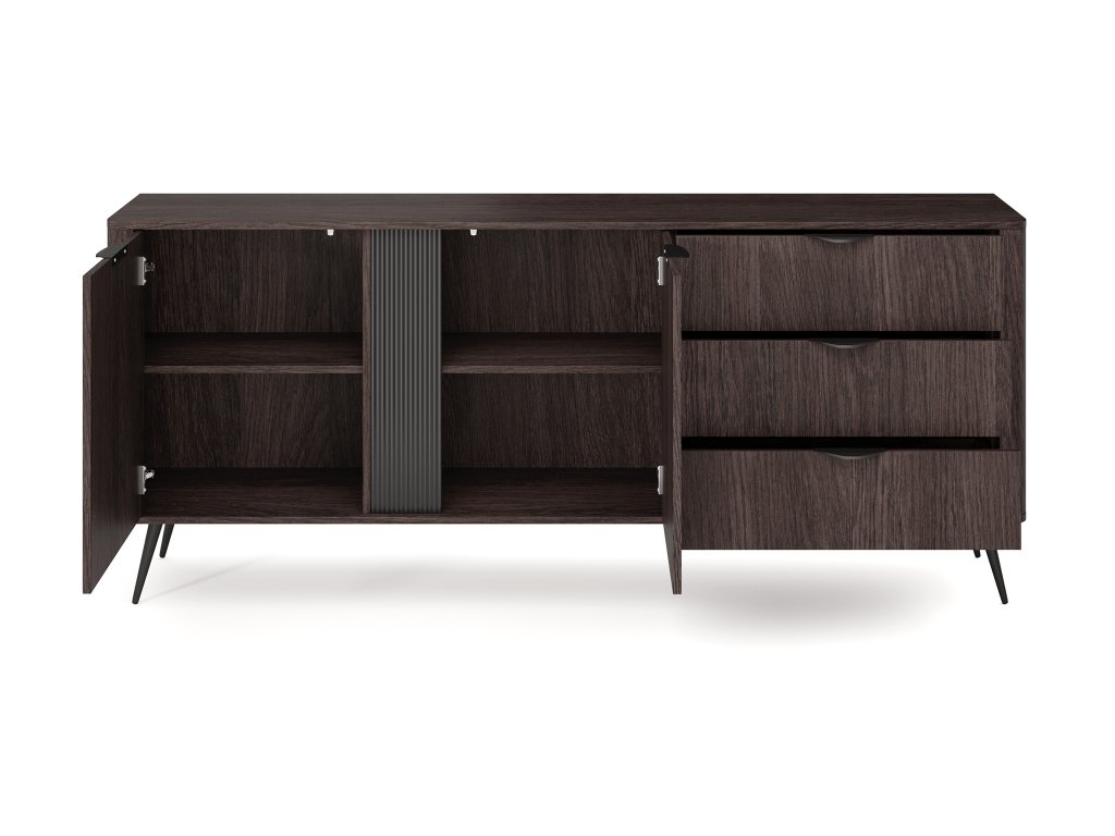 Vnútorné členenie komody je navrhnuté tak, aby poskytovalo maximálny úložný komfort. Nájdete v nej tri zásuvky vhodné na drobnosti či textílie a dvoje dvierok s pántovým otváraním, za ktorými sa nachádzajú štyri praktické poličky. Tie ponúkajú priestor na organizované odkladanie doplnkov, dokumentov alebo riadu. Vďaka svojmu premyslenému spracovaniu a estetickým detailom sa táto široká kvalitná komoda hodí do obývačky, spálne aj jedálne, kde prinesie poriadok aj štýlový vzhľad.