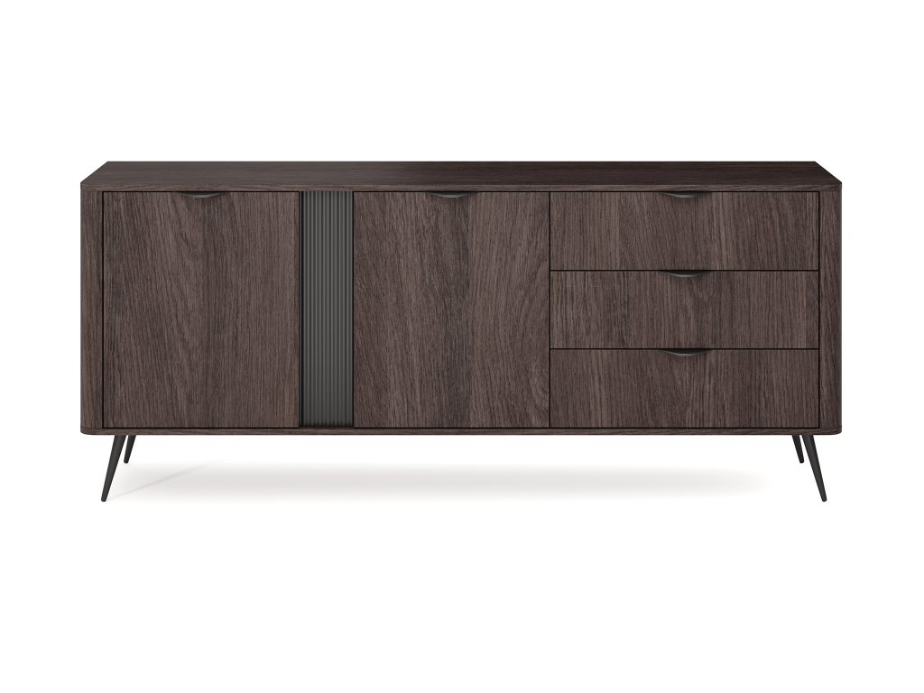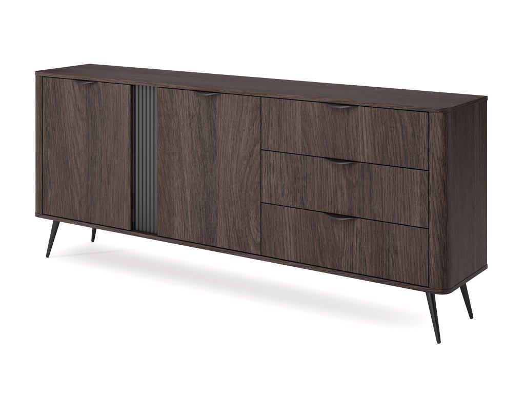 Ak hľadáte nábytok, ktorý vám poskytne dostatok miesta a zároveň doplní interiér o atraktívny dizajnový prvok? Komoda Veris 195 2D3S je ideálnou voľbou. Vyznačuje sa šírkou 195 cm a nadčasovým prevedením v dekore dub dunin, ktorý zapadne do každého moderného priestoru. Kvalitné spracovanie dopĺňajú ryhované MDF prvky, lamely, zaoblené bočné dosky a pevné kovové úchytky. Komoda stojí na stabilných čiernych nožičkách.