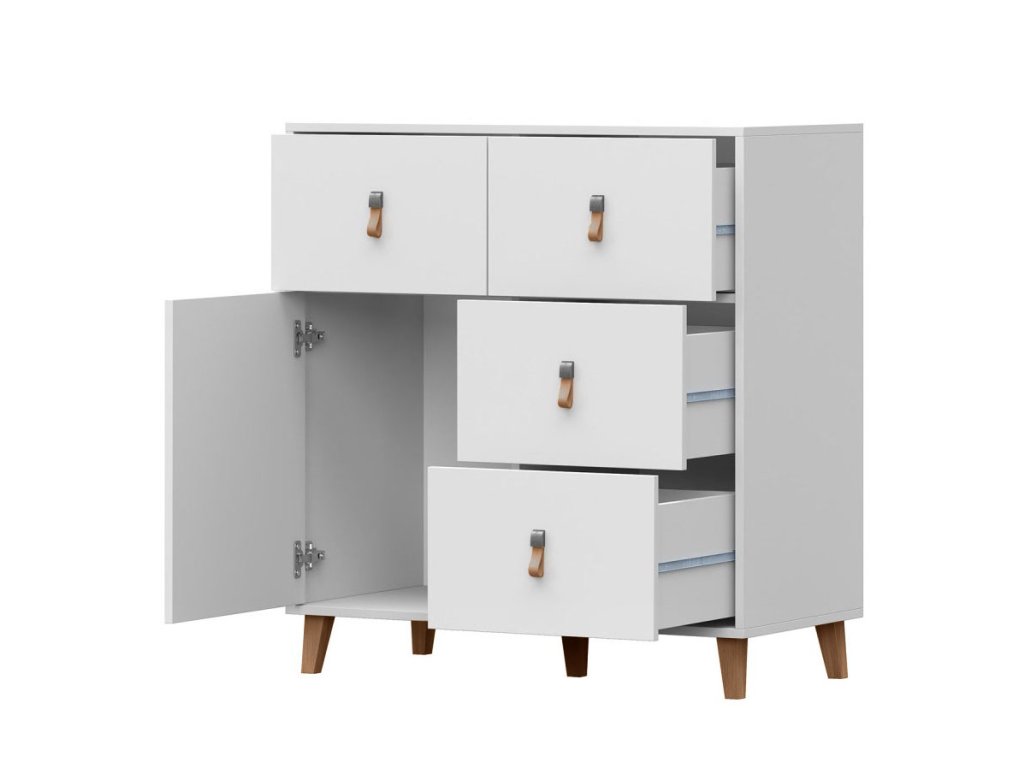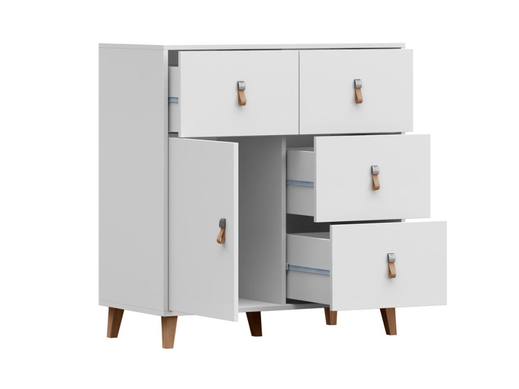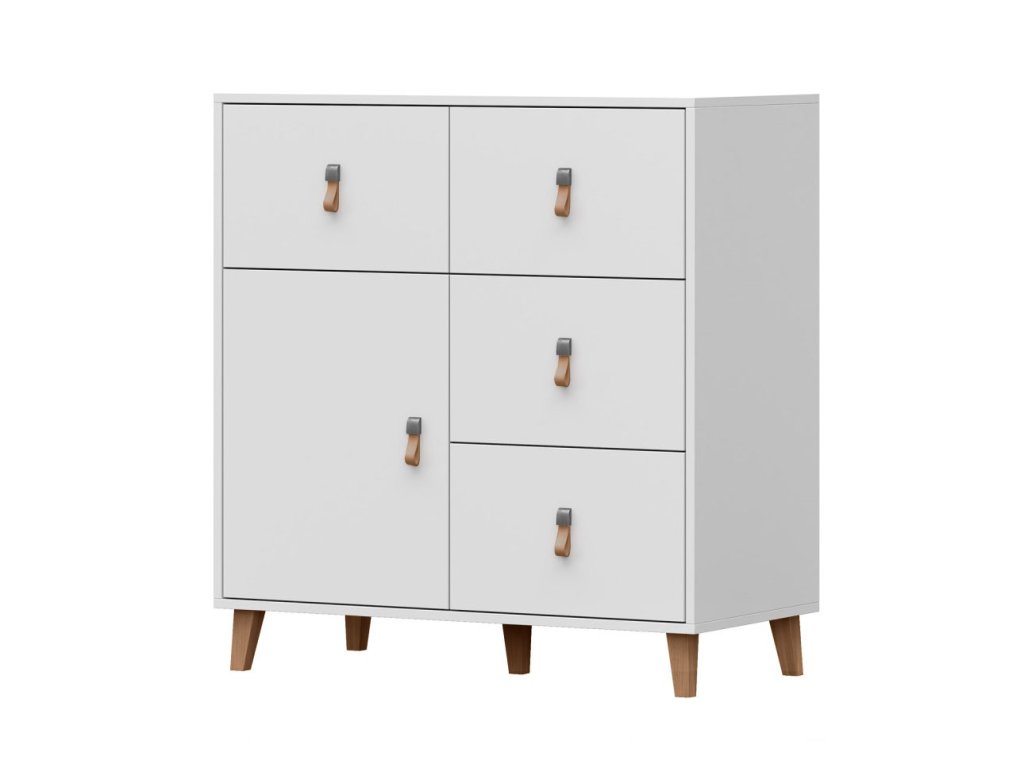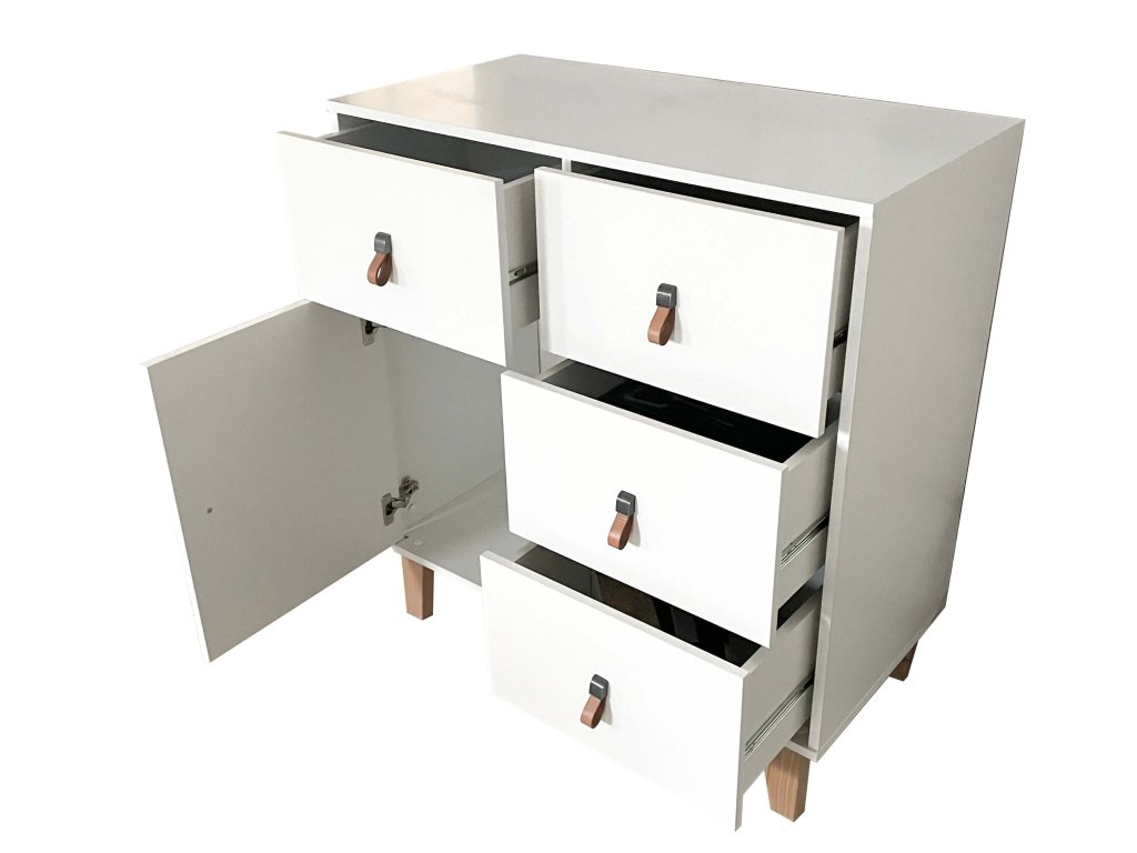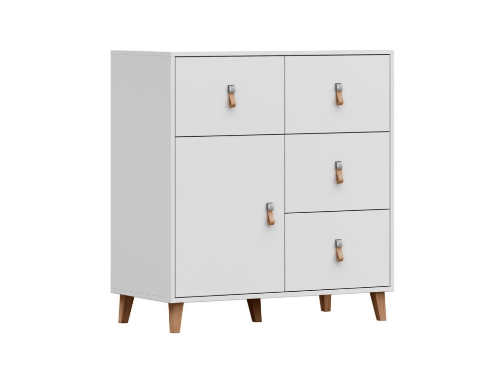 Moderná biela komoda s 3 zásuvkami a 1 dverami, Vám pomôže udržať poriadok v detskej alebo obývacej izbe.